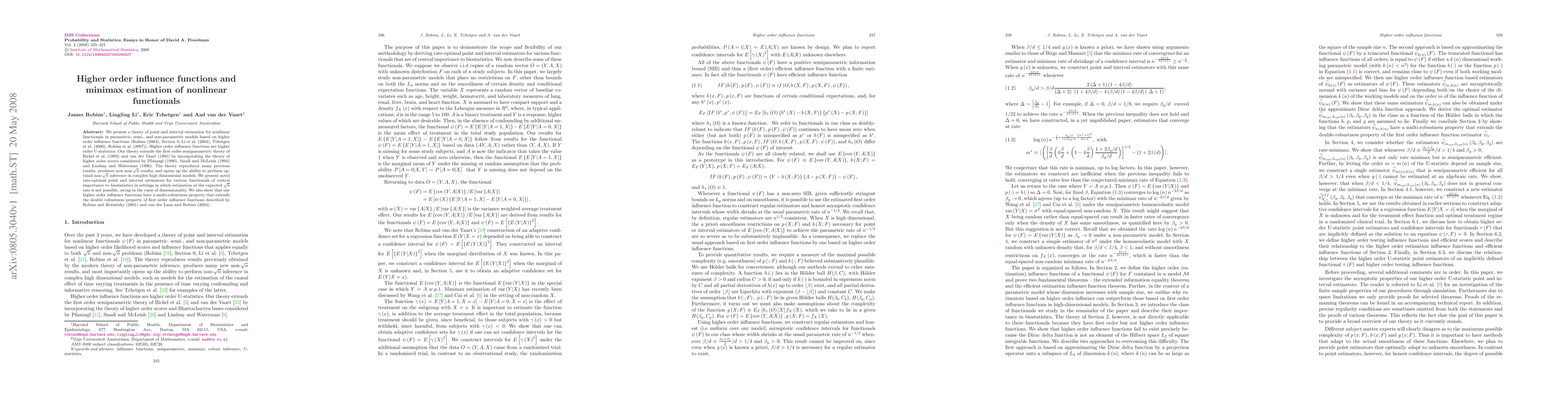 We present a theory of point and interval estimation for nonlinear functionals in parametric, semi-, and non-parametric models based on higher order influence functions (Robins (2004), Section 9; Li et al. (2004), Tchetgen et al. (2006), Robins et al. (2007)). Higher order influence functions are higher order U-statistics. Our theory extends the first order semiparametric theory of Bickel et al. (1993) and van der Vaart (1991) by incorporating the theory of higher order scores considered by Pfanzagl (1990), Small and McLeish (1994) and Lindsay and Waterman (1996). The theory reproduces many previous results, produces new non-$\sqrt{n}$ results, and opens up the ability to perform optimal non-$\sqrt{n}$ inference in complex high dimensional models. We present novel rate-optimal point and interval estimators for various functionals of central importance to biostatistics in settings in which estimation at the expected $\sqrt{n}$ rate is not possible, owing to the curse of dimensionality. We also show that our higher order influence functions have a multi-robustness property that extends the double robustness property of first order influence functions described by Robins and Rotnitzky (2001) and van der Laan and Robins (2003).