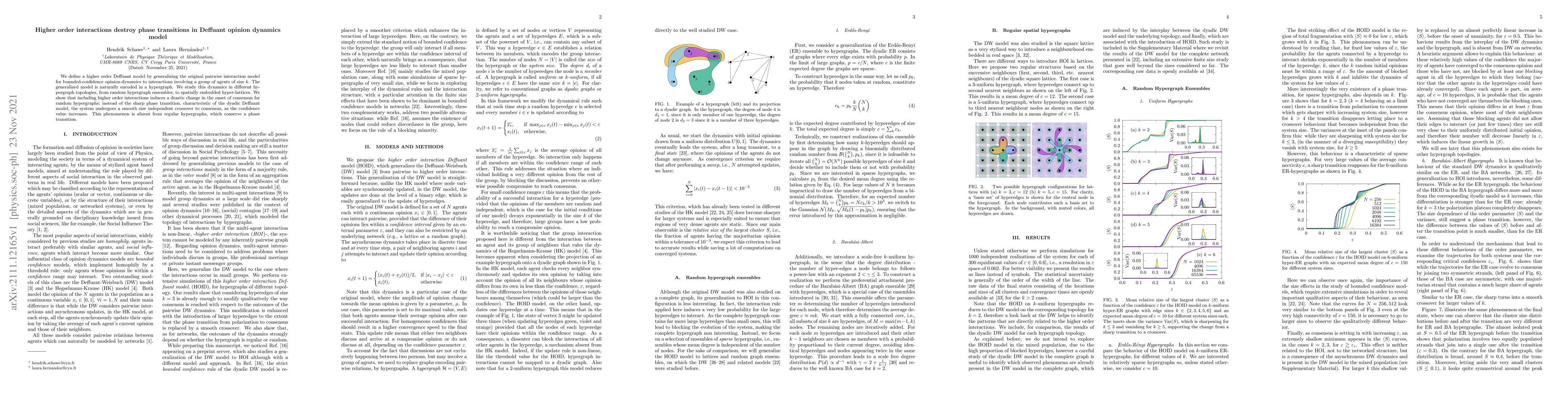 This paper generalizes the Deffuant model to include higher order interactions among groups of agents, finding that such interactions eliminate sharp phase transitions in consensus formation for random hypergraphs, leading instead to a smooth crossover, while regular hypergraphs retain the original phase transition.