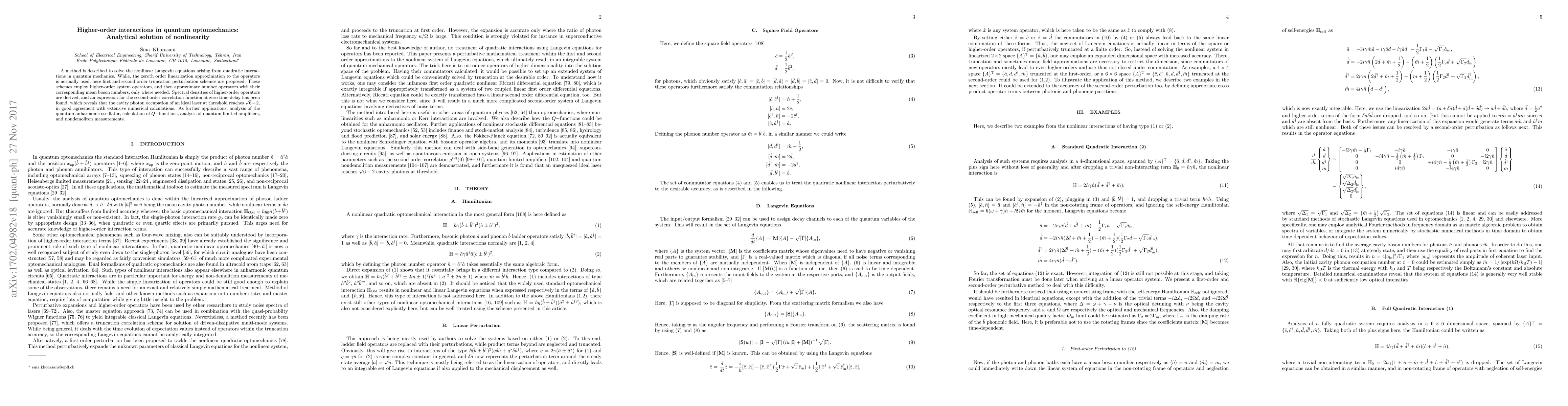 A method is described to solve the nonlinear Langevin equations arising from quadratic interactions in quantum mechanics. While, the zeroth order linearization approximation to the operators is normally used, here first and second order truncation perturbation schemes are proposed. These schemes employ higher-order system operators, and then approximate number operators with their corresponding mean boson numbers, only where needed. Spectral densities of higher-order operators are derived, and an expression for the second-order correlation function at zero time-delay has been found, which reveals that the cavity photon occupation of an ideal laser at threshold reaches $\sqrt{6}-2$, in good agreement with extensive numerical calculations. As further applications, analysis of the quantum anharmonic oscillator, calculation of $Q-$functions, analysis of quantum limited amplifiers, and nondemoliton measurements.