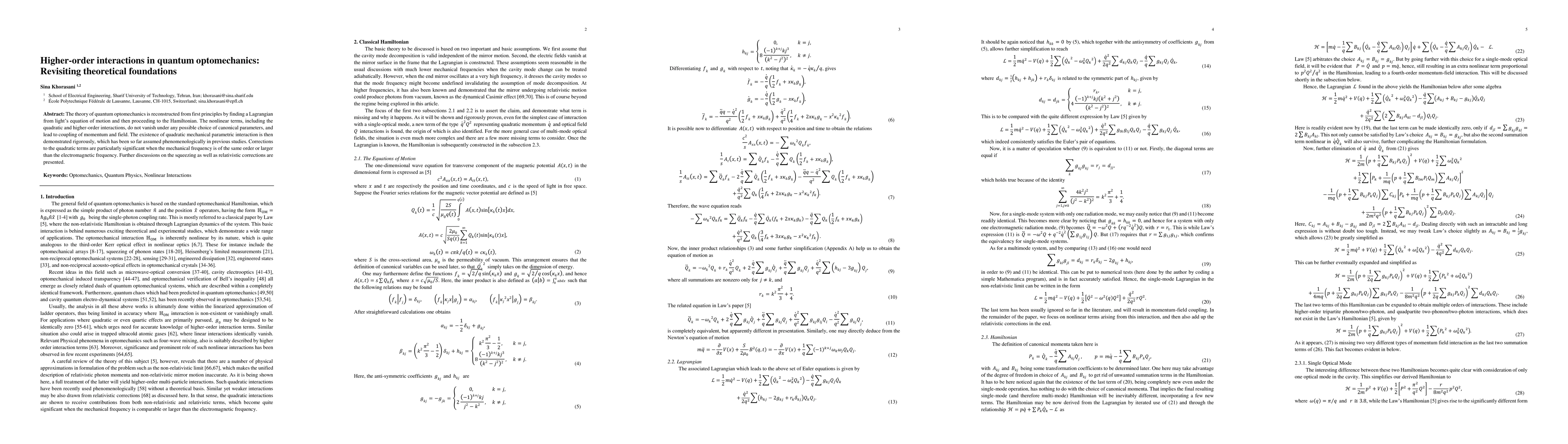 The theory of quantum optomechanics is reconstructed from first principles by finding a Lagrangian from light's equation of motion and then proceeding to the Hamiltonian. The nonlinear terms, including the quadratic and higher-order interactions, do not vanish under any possible choice of canonical parameters, and lead to coupling of momentum and field. The existence of quadratic mechanical parametric interaction is then demonstrated rigorously, which has been so far assumed phenomenologically in previous studies. Corrections to the quadratic terms are particularly significant when the mechanical frequency is of the same order or larger than the electromagnetic frequency. Further discussions on the squeezing as well as relativistic corrections are presented.