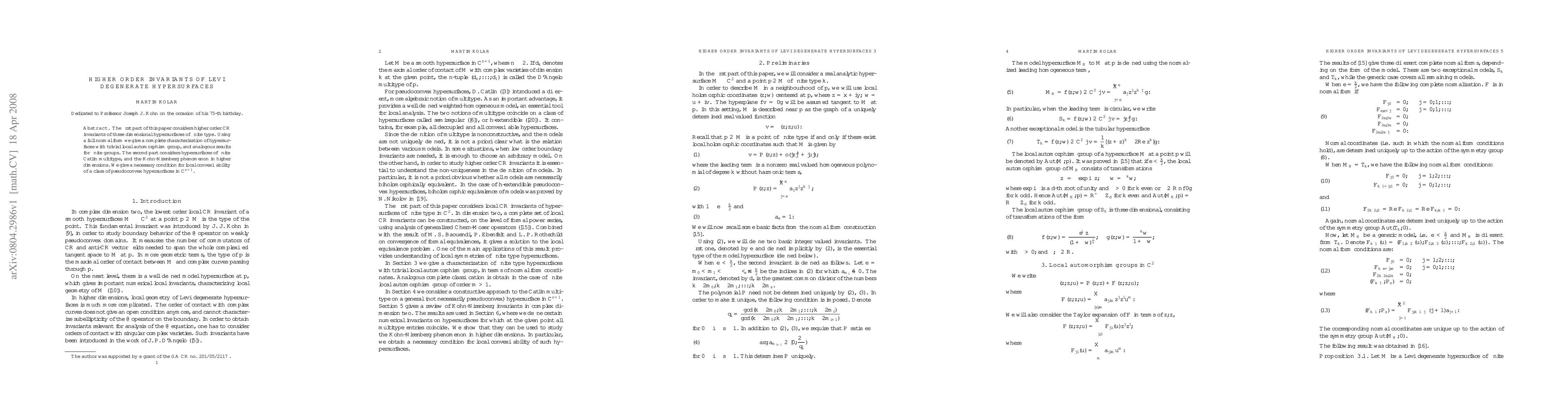 The first part of this paper considers higher order CR invariants of three dimensional hypersurfaces of finite type. Using a full normal form we give a complete characterization of hypersurfaces with trivial local automorphism group, and analogous results for finite groups. The second part considers hypersurfaces of finite Catlin multitype and the Kohn-Nirenberg phenomenon in higher dimensions. We give a necessary condition for local convexifiability of a class of pseudoconvex hypersurfaces in $\mathbb C^{n+1}$.