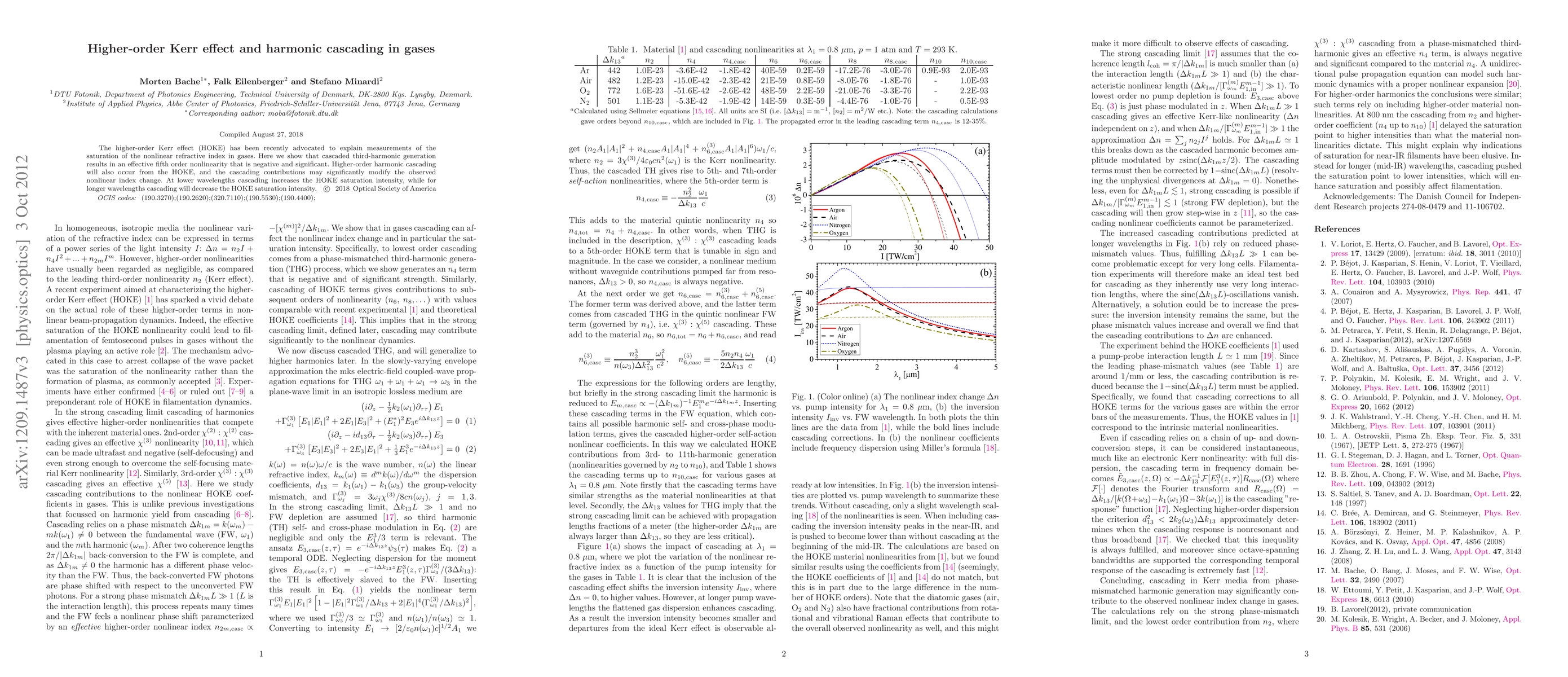 The research investigates the higher-order Kerr effect in gases, demonstrating that cascaded third-harmonic generation creates an effective fifth-order nonlinearity. Cascading effects can significantly alter the observed nonlinear refractive index, with different impacts at varying wavelengths.