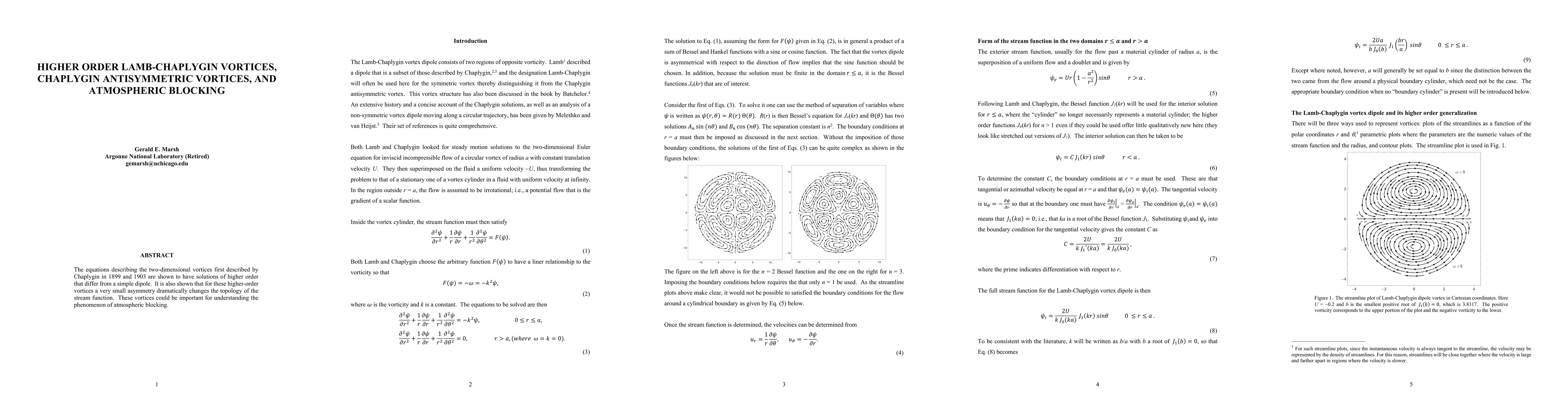 The equations describing the two-dimensional vortices first described by Chaplygin in 1899 and 1903 are shown to have solutions of higher order that differ from a simple dipole. It is also shown that for these higher-order vortices a very small asymmetry dramatically changes the topology of the stream function. These vortices could be important for understanding the phenomenon of atmospheric blocking.
