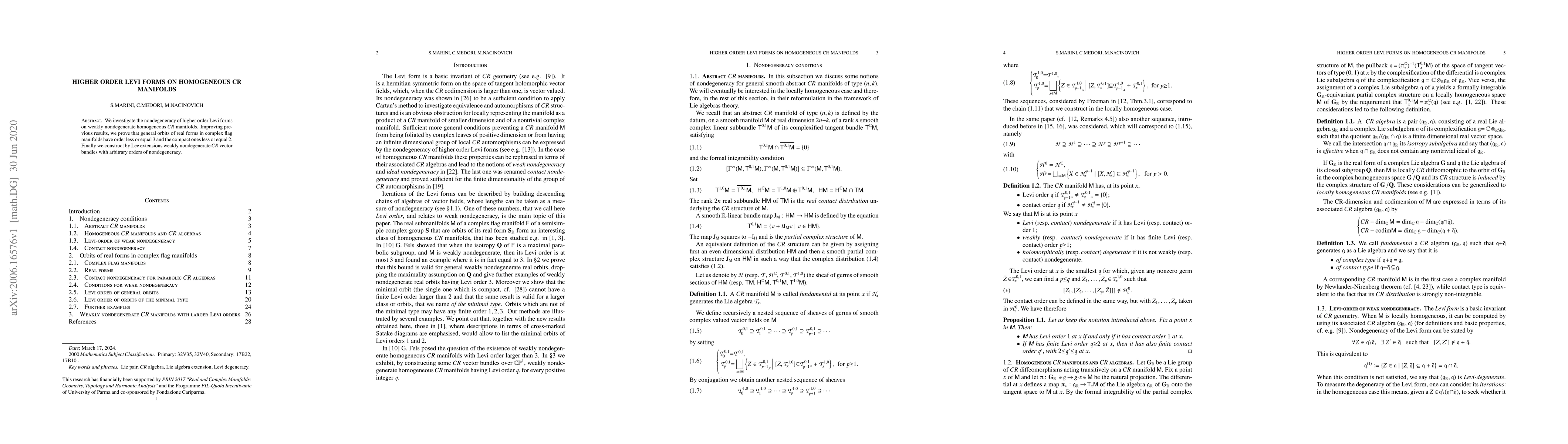 This paper explores the nondegeneracy of higher order Levi forms on weakly nondegenerate homogeneous CR manifolds, proving that real forms in complex flag manifolds have Levi form orders ≤ 3 in general and ≤ 2 for compact forms. It also constructs weakly nondegenerate CR vector bundles with any desired order of nondegeneracy using Lee extensions.