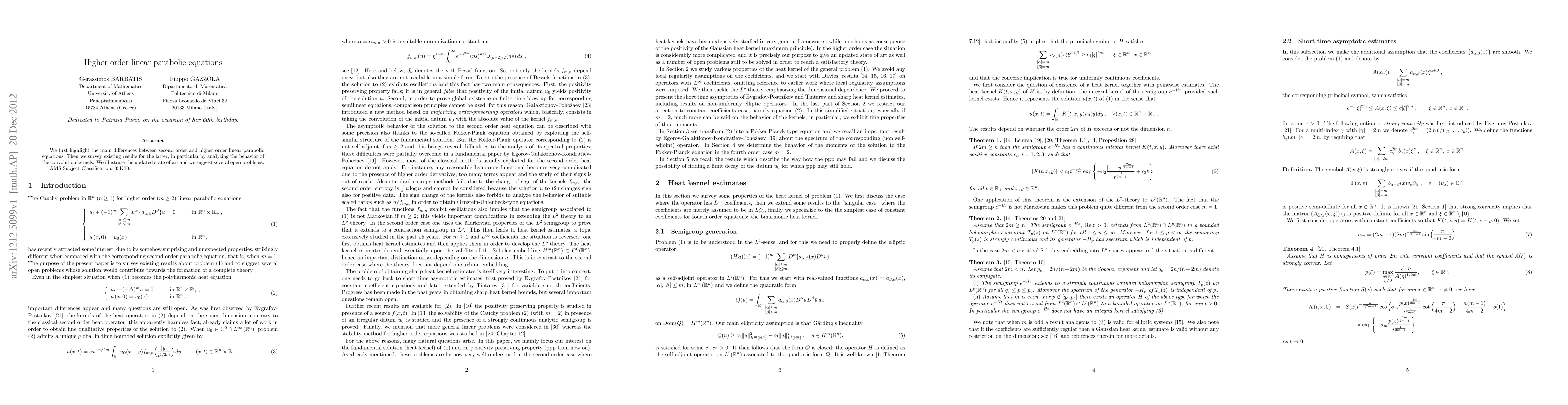 This paper contrasts second-order and higher-order linear parabolic equations, surveys current findings, particularly regarding the behavior of convolution kernels, and proposes several open research questions.