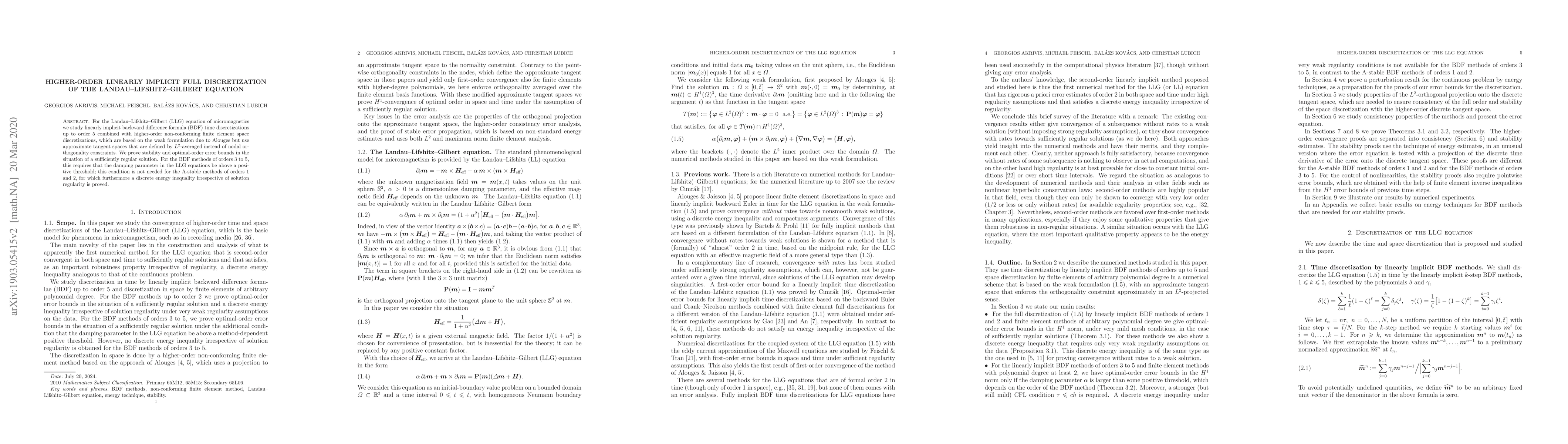 For the Landau--Lifshitz--Gilbert (LLG) equation of micromagnetics we study linearly implicit backward difference formula (BDF) time discretizations up to order $5$ combined with higher-order non-conforming finite element space discretizations, which are based on the weak formulation due to Alouges but use approximate tangent spaces that are defined by $L^2$-averaged instead of nodal orthogonality constraints. We prove stability and optimal-order error bounds in the situation of a sufficiently regular solution. For the BDF methods of orders $3$ to~$5$, this requires %a mild time step restriction $\tau \leqslant ch$ and that the damping parameter in the LLG equations be above a positive threshold; this condition is not needed for the A-stable methods of orders $1$ and $2$, for which furthermore a discrete energy inequality irrespective of solution regularity is proved.