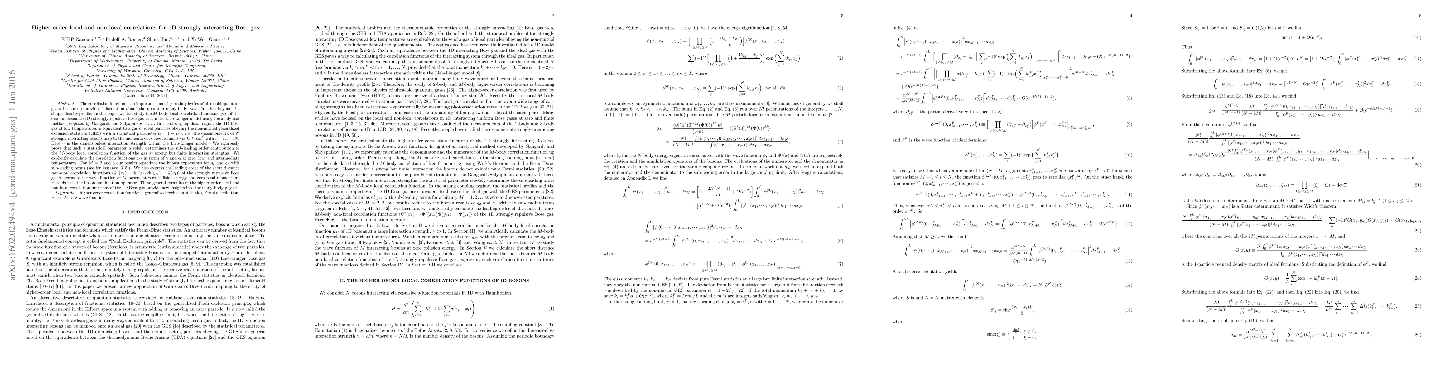 This paper investigates higher-order local and non-local correlation functions in a 1D strongly interacting Bose gas using the Lieb-Liniger model. It reveals that the statistical parameter $\alpha$ determines the sub-leading contributions to $M$-body local correlation functions, and provides explicit expressions for these functions at various temperatures.
