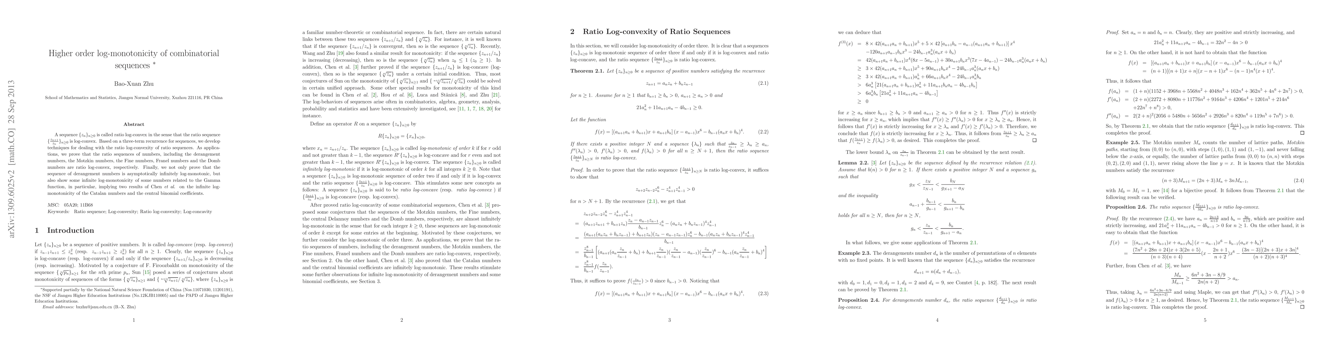 This paper develops techniques for establishing higher-order log-monotonicity in combinatorial sequences, specifically proving the ratio log-convexity of sequences such as derangement, Motzkin, Fine, Franel, and Domb numbers. It also demonstrates the asymptotic infinite log-monotonicity of derangement numbers and related Gamma function numbers, confirming previous results on Catalan numbers and central binomial coefficients.