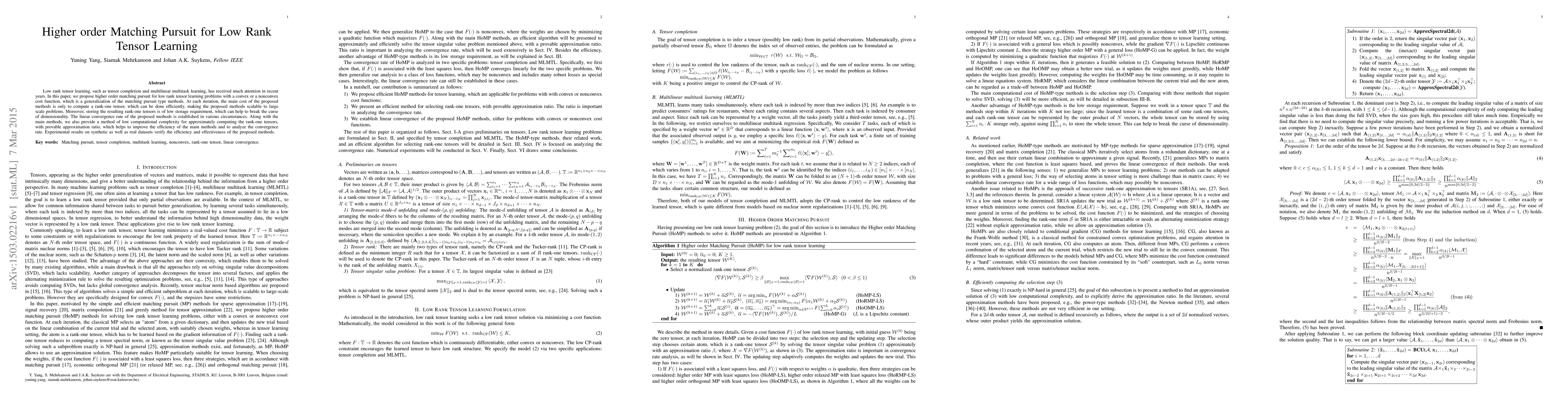 This paper proposes higher order matching pursuit for low rank tensor learning, which is scalable and efficient due to its low storage requirement and ability to compute rank-one tensors at each iteration. The methods are shown to have a linear convergence rate, with an additional computationally efficient approximation method provided to enhance performance.