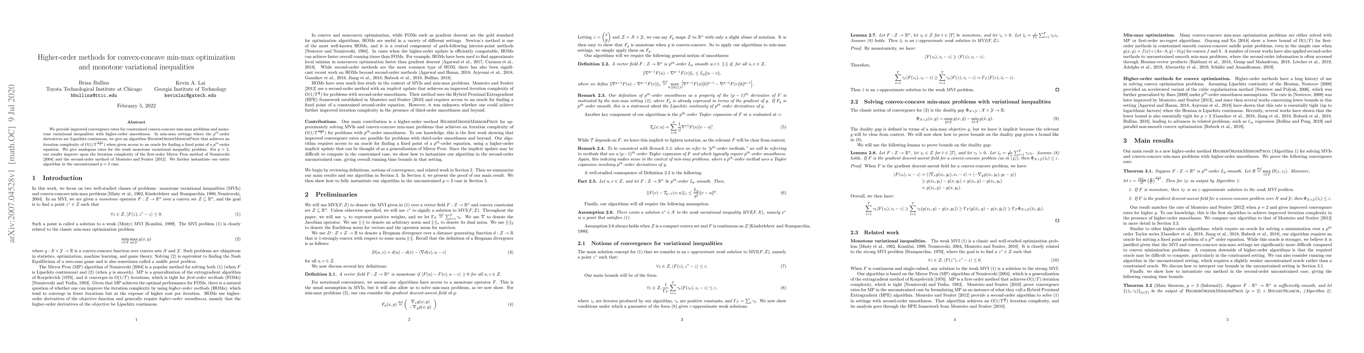 We provide improved convergence rates for constrained convex-concave min-max problems and monotone variational inequalities with higher-order smoothness. In min-max settings where the $p^{th}$-order derivatives are Lipschitz continuous, we give an algorithm HigherOrderMirrorProx that achieves an iteration complexity of $O(1/T^{\frac{p+1}{2}})$ when given access to an oracle for finding a fixed point of a $p^{th}$-order equation. We give analogous rates for the weak monotone variational inequality problem. For $p>2$, our results improve upon the iteration complexity of the first-order Mirror Prox method of Nemirovski [2004] and the second-order method of Monteiro and Svaiter [2012]. We further instantiate our entire algorithm in the unconstrained $p=2$ case.