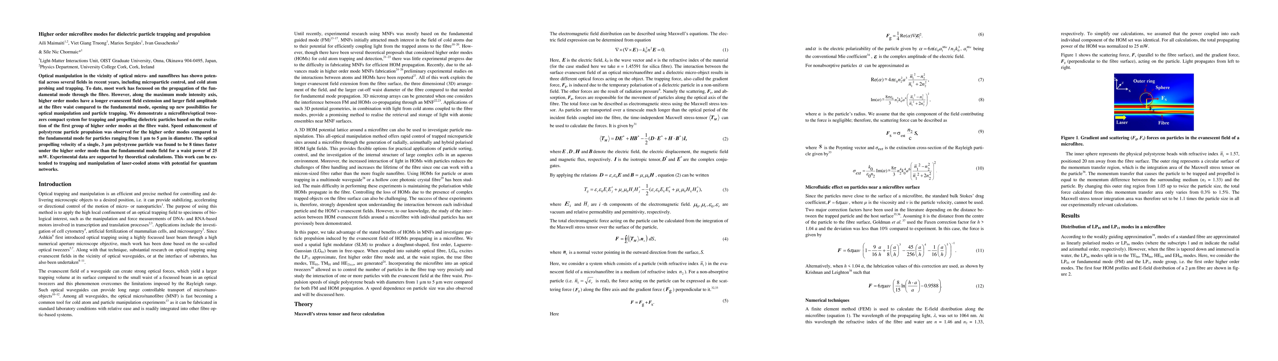 This paper demonstrates a microfibre/optical tweezers system that utilizes higher order modes for trapping and propelling dielectric particles. The study shows that higher order modes exhibit enhanced particle propulsion speed compared to the fundamental mode, achieving up to 8 times faster velocity for 3 μm polystyrene particles, supported by both experimental and theoretical analyses.