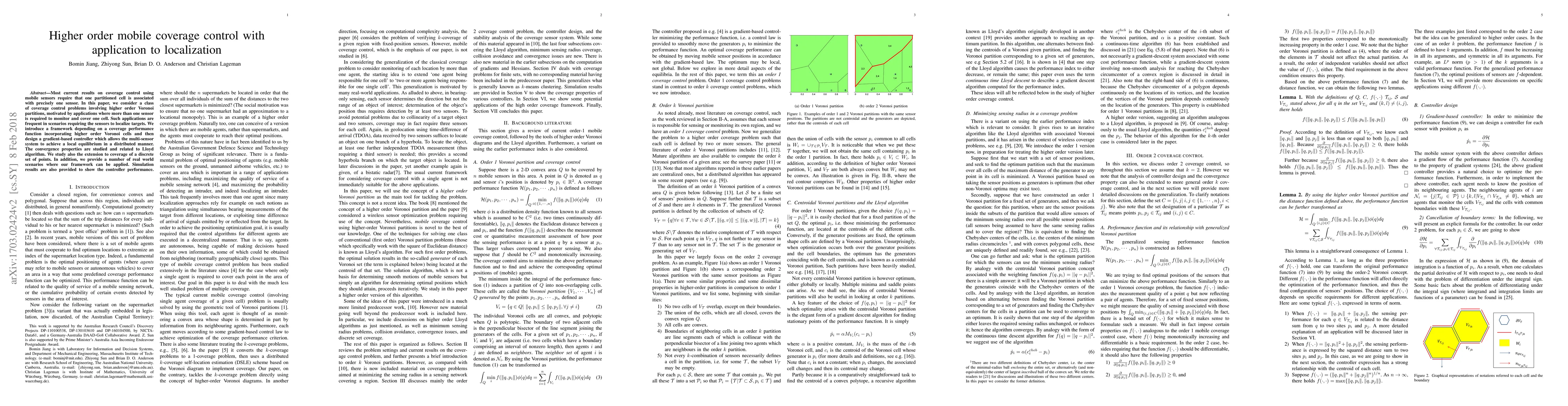 This paper proposes a framework for higher order mobile coverage control using multiple sensors per Voronoi cell, focusing on localization applications. It introduces a gradient-based controller enabling distributed local equilibrium and studies its convergence properties, extending the approach to cover discrete points. Simulation results demonstrate the controller's effectiveness.