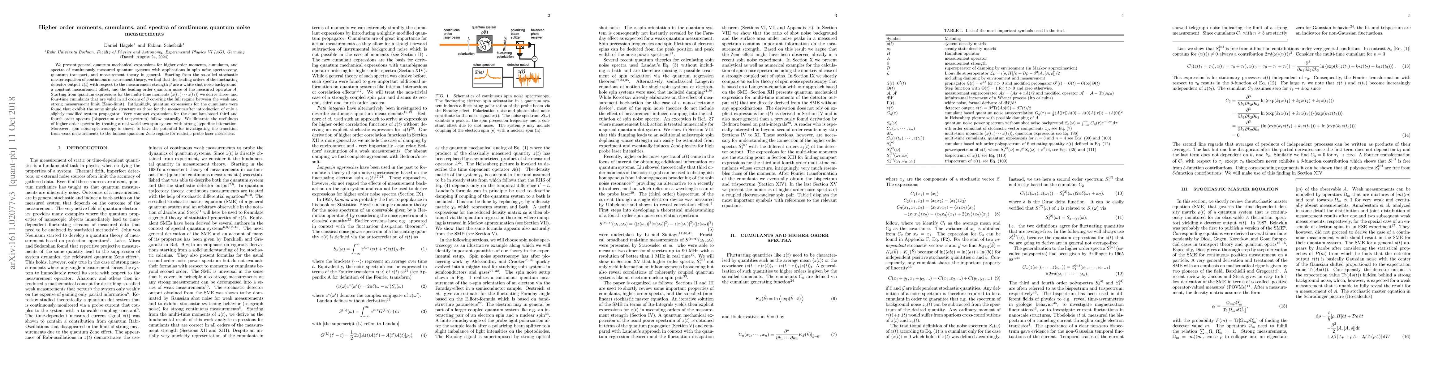 We present general quantum mechanical expressions for higher order moments, cumulants, and spectra of continuously measured quantum systems with applications in spin noise spectroscopy, quantum transport, and measurement theory in general. Starting from the so-called stochastic master equation of continuous measurement theory, we find that the leading orders of the fluctuating detector output $z(t)$ with respect to the measurement strength $\beta$ are a white shot noise background, a constant measurement offset, and the leading order quantum noise of the measured operator $A$. Starting from quantum expressions for the multi-time moments $\langle z(t_n)\cdots z(t_1) \rangle$ we derive three- and four-time cumulants that are valid in all orders of $\beta$ covering the full regime between the weak and strong measurement limit (Zeno-limit). Intriguingly, quantum expressions for the cumulants were found that exhibit the same simple structure as those for the moments after introduction of only a slightly modified system propagator. Very compact expressions for the cumulant-based third and fourth order spectra (bispectrum and trispectrum) follow naturally. We illustrate the usefulness of higher order spectra by treating a real world two-spin system with strong hyperfine interaction.Moreover, spin noise spectroscopy is shown to have the potential for investigating the transition from weak measurements to the famous quantum Zeno regime for realistic probe laser intensities.