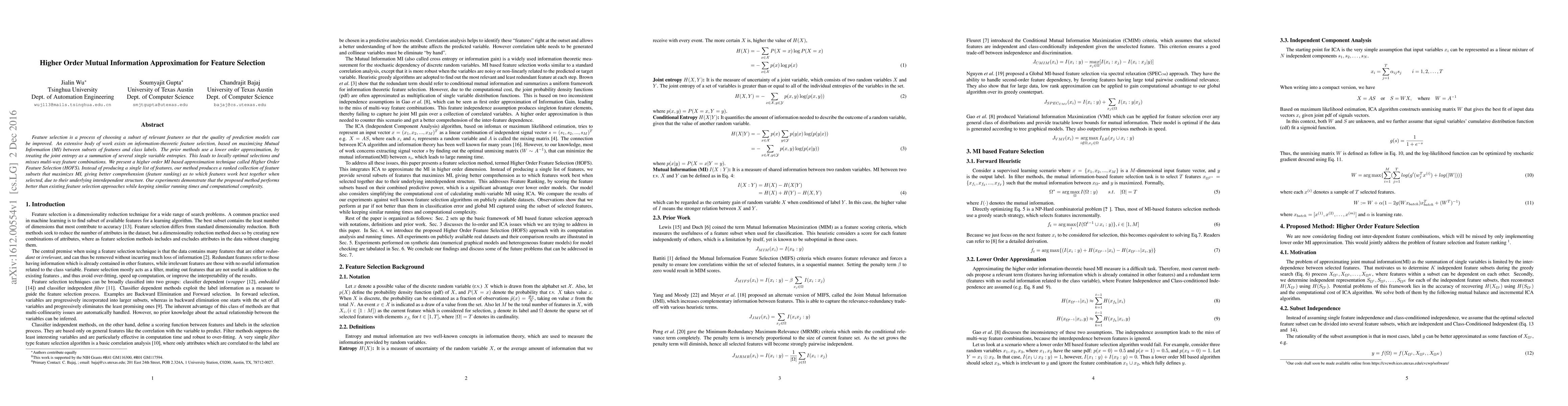 Feature selection is a process of choosing a subset of relevant features so that the quality of prediction models can be improved. An extensive body of work exists on information-theoretic feature selection, based on maximizing Mutual Information (MI) between subsets of features and class labels. The prior methods use a lower order approximation, by treating the joint entropy as a summation of several single variable entropies. This leads to locally optimal selections and misses multi-way feature combinations. We present a higher order MI based approximation technique called Higher Order Feature Selection (HOFS). Instead of producing a single list of features, our method produces a ranked collection of feature subsets that maximizes MI, giving better comprehension (feature ranking) as to which features work best together when selected, due to their underlying interdependent structure. Our experiments demonstrate that the proposed method performs better than existing feature selection approaches while keeping similar running times and computational complexity.