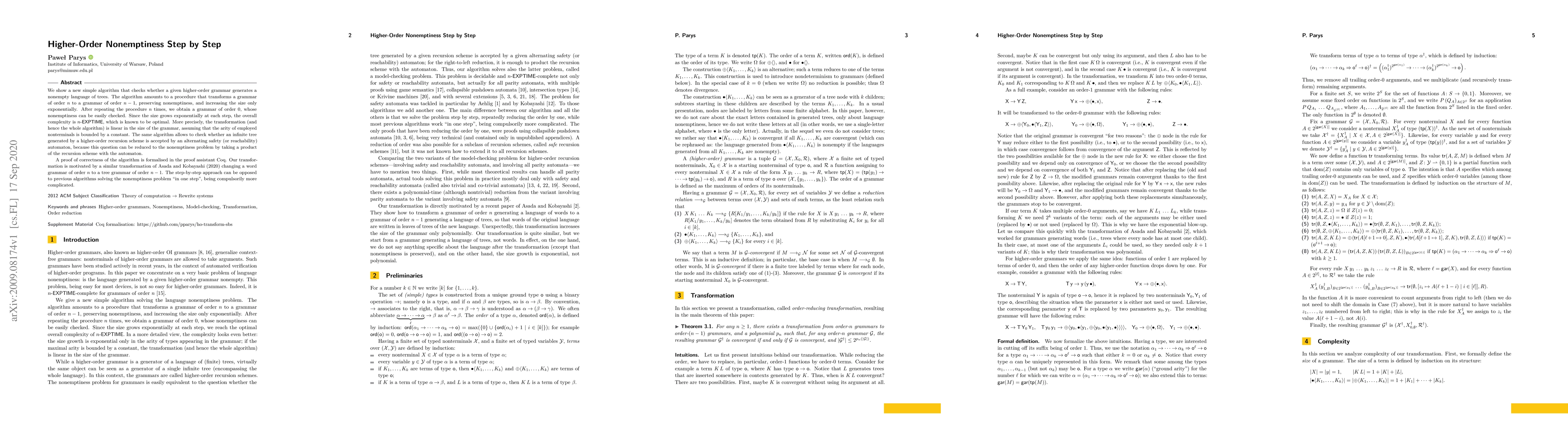 We show a new simple algorithm that checks whether a given higher-order grammar generates a nonempty language of trees. The algorithm amounts to a procedure that transforms a grammar of order n to a grammar of order n-1, preserving nonemptiness, and increasing the size only exponentially. After repeating the procedure n times, we obtain a grammar of order 0, whose nonemptiness can be easily checked. Since the size grows exponentially at each step, the overall complexity is n-EXPTIME, which is known to be optimal. More precisely, the transformation (and hence the whole algorithm) is linear in the size of the grammar, assuming that the arity of employed nonterminals is bounded by a constant. The same algorithm allows to check whether an infinite tree generated by a higher-order recursion scheme is accepted by an alternating safety (or reachability) automaton, because this question can be reduced to the nonemptiness problem by taking a product of the recursion scheme with the automaton. A proof of correctness of the algorithm is formalised in the proof assistant Coq. Our transformation is motivated by a similar transformation of Asada and Kobayashi (2020) changing a word grammar of order n to a tree grammar of order n-1. The step-by-step approach can be opposed to previous algorithms solving the nonemptiness problem "in one step", being compulsorily more complicated.