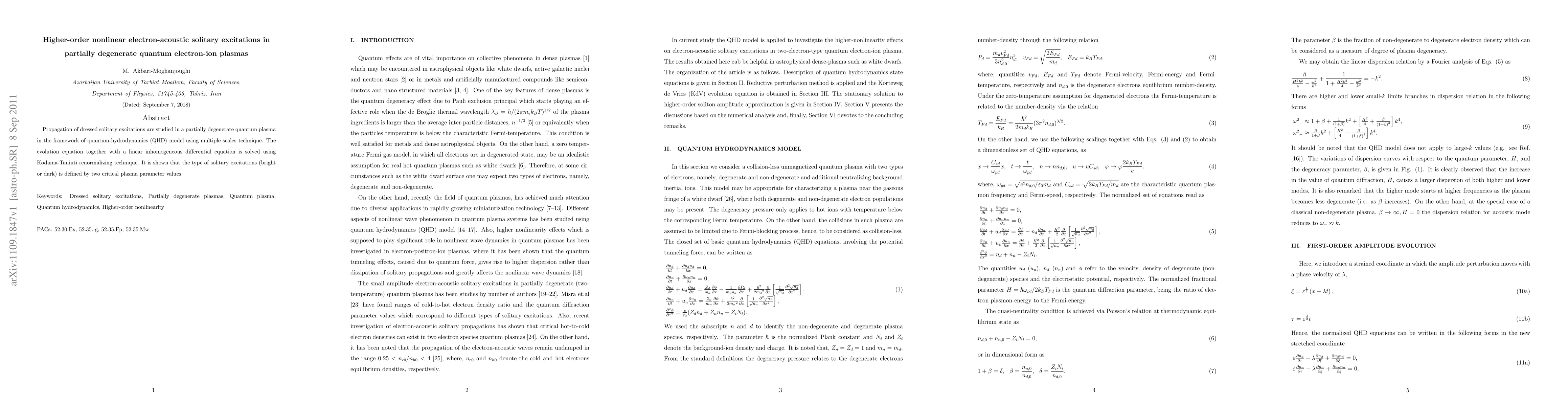 Propagation of dressed solitary excitations are studied in a partially degenerate quantum plasma in the framework of quantum-hydrodynamics (QHD) model using multiple scales technique. The evolution equation together with a linear inhomogeneous differential equation is solved using Kodama-Taniuti renormalizing technique. It is shown that the type of solitary excitations (bright or dark) is defined by two critical plasma parameter values.