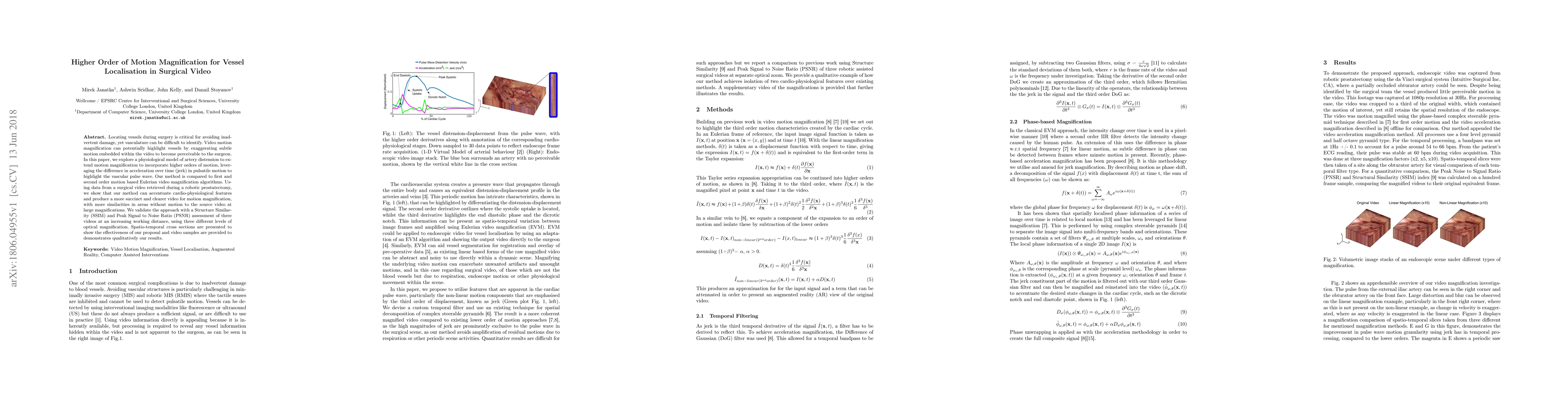Locating vessels during surgery is critical for avoiding inadvertent damage, yet vasculature can be difficult to identify. Video motion magnification can potentially highlight vessels by exaggerating subtle motion embedded within the video to become perceivable to the surgeon. In this paper, we explore a physiological model of artery distension to extend motion magnification to incorporate higher orders of motion, leveraging the difference in acceleration over time (jerk) in pulsatile motion to highlight the vascular pulse wave. Our method is compared to first and second order motion based Eulerian video magnification algorithms. Using data from a surgical video retrieved during a robotic prostatectomy, we show that our method can accentuate cardio-physiological features and produce a more succinct and clearer video for motion magnification, with more similarities in areas without motion to the source video at large magnifications. We validate the approach with a Structure Similarity (SSIM) and Peak Signal to Noise Ratio (PSNR) assessment of three videos at an increasing working distance, using three different levels of optical magnification. Spatio-temporal cross sections are presented to show the effectiveness of our proposal and video samples are provided to demonstrates qualitatively our results.