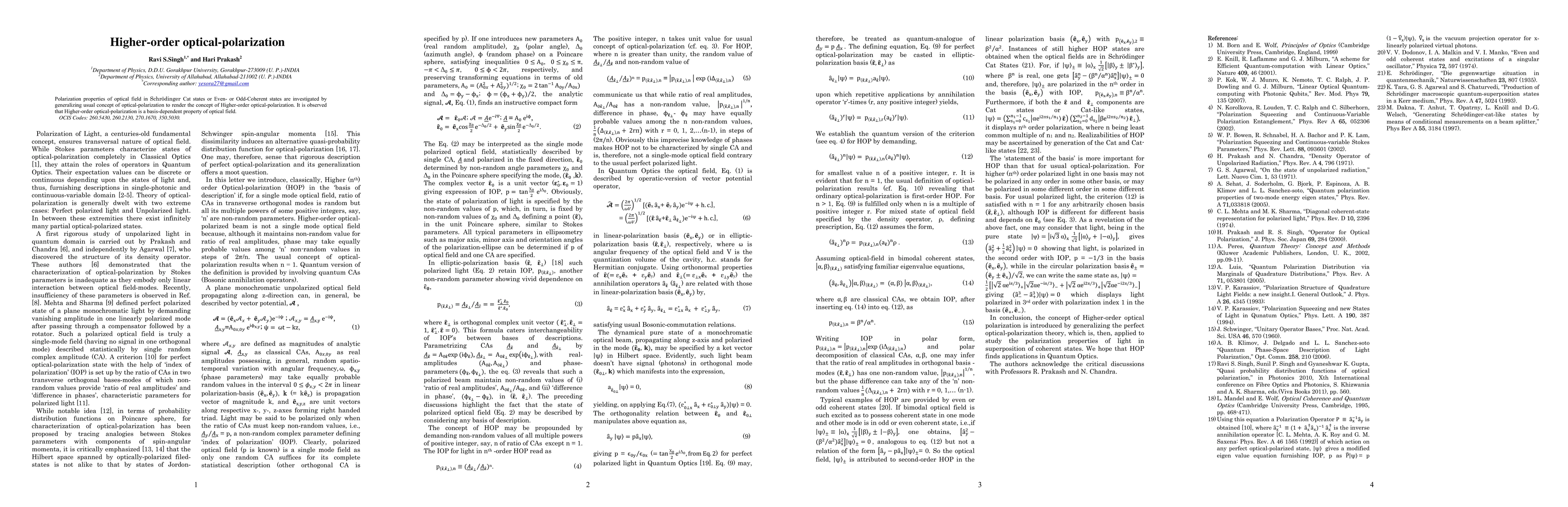 Polarization properties of optical field in Schr\"odinger Cat states or Even- or Odd-Coherent states are investigated by generalizing usual concept of optical-polarization to render the concept of Higher-order optical-polarization. It is observed that Higher-order optical-polarization is a basis-dependent property of optical field.