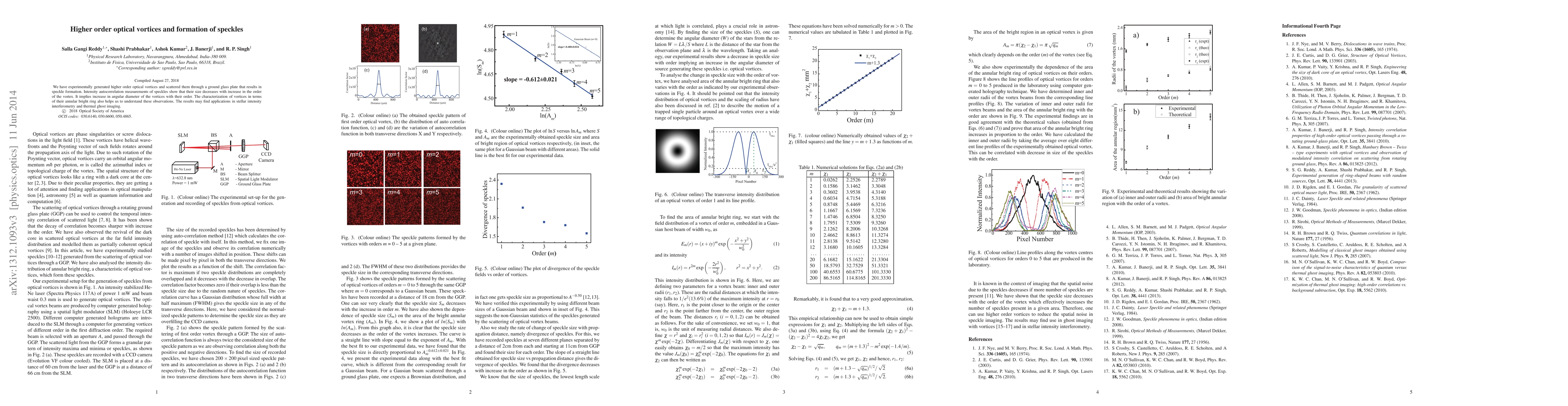 We have experimentally generated higher order optical vortices and scattered them through a ground glass plate that results in speckle formation. Intensity autocorrelation measurements of speckles show that their size decreases with increase in the order of the vortex. It implies increase in angular diameter of the vortices with their order. The characterization of vortices in terms of their annular bright ring also helps us to understand these observations. The results may find applications in stellar intensity interferometry and thermal ghost imaging.