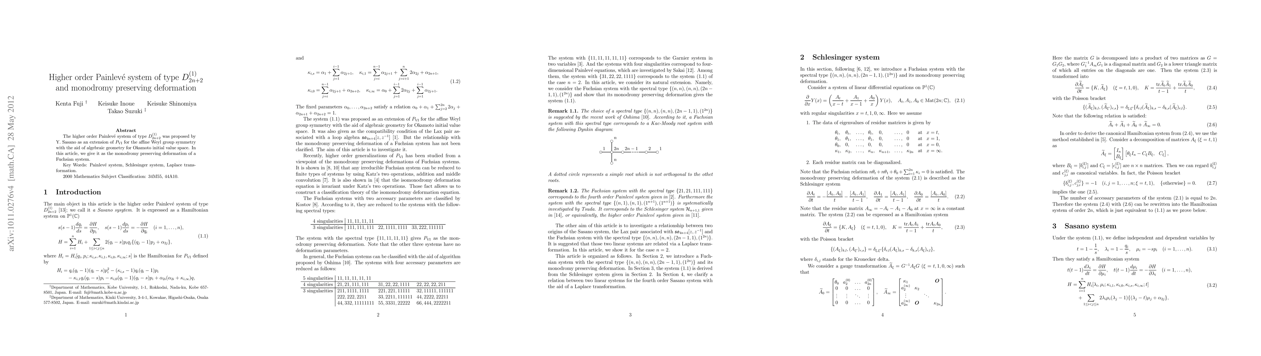 This paper explores the higher order Painleve system of type D^{(1)}_{2n+2}, proposed by Y. Sasano, and demonstrates its derivation as a monodromy preserving deformation of a Fuchsian system, utilizing algebraic geometry for Okamoto's initial value space.