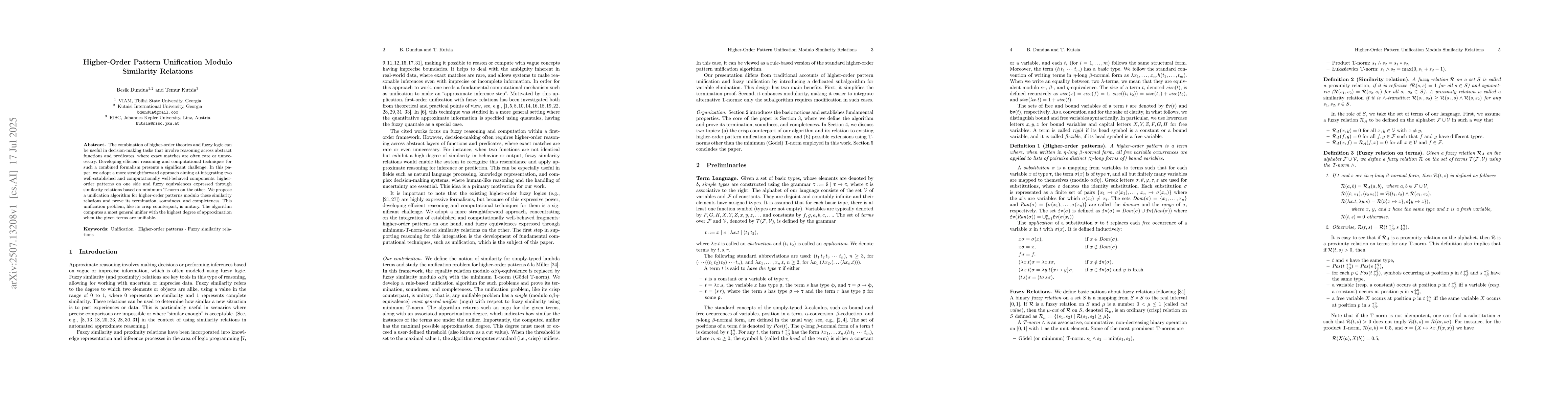 The combination of higher-order theories and fuzzy logic can be useful in decision-making tasks that involve reasoning across abstract functions and predicates, where exact matches are often rare or unnecessary. Developing efficient reasoning and computational techniques for such a combined formalism presents a significant challenge. In this paper, we adopt a more straightforward approach aiming at integrating two well-established and computationally well-behaved components: higher-order patterns on one side and fuzzy equivalences expressed through similarity relations based on minimum T-norm on the other. We propose a unification algorithm for higher-order patterns modulo these similarity relations and prove its termination, soundness, and completeness. This unification problem, like its crisp counterpart, is unitary. The algorithm computes a most general unifier with the highest degree of approximation when the given terms are unifiable.