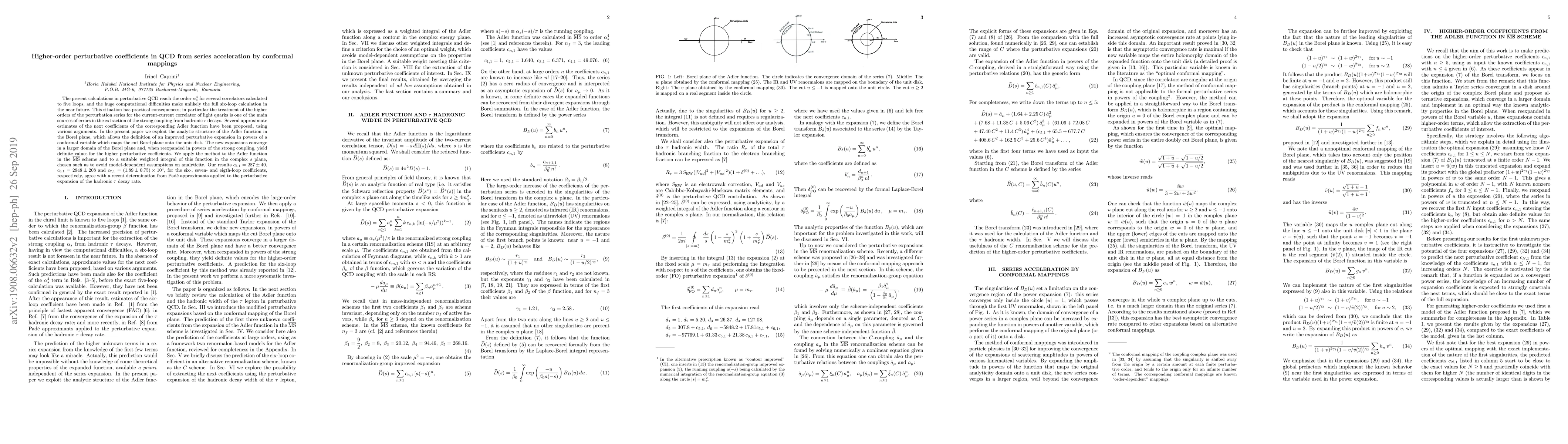 The present calculations in perturbative QCD reach the order $\alpha_s^4$ for several correlators calculated to five loops, and the huge computational difficulties make unlikely the full six-loop calculation in the near future. This situation has practical consequences, in particular the treatment of the higher orders of the perturbation series for the current-current correlator of light quarks is one of the main sources of errors in the extraction of the strong coupling from hadronic $\tau$ decays. Several approximate estimates of the next coefficients of the corresponding Adler function have been proposed, using various arguments. In the present paper we exploit the analytic structure of the Adler function in the Borel plane, which allows the definition of an improved perturbative expansion in powers of a conformal variable which maps the cut Borel plane onto the unit disk. The new expansions converge in a larger domain of the Borel plane and, when reexpanded in powers of the strong coupling, yield definite values for the higher perturbative coefficients. We apply the method to the Adler function in the $\bar{\rm MS}$ scheme and to a suitable weighted integral of this function in the complex $s$ plane, chosen such as to avoid model-dependent assumptions on analyticity. Our results $c_{5,1}=287 \pm 40$, $c_{6,1}=2948 \pm 208$ and $c_{7,1}=(1.89 \pm 0.75)\times 10^4$, for the six, seven and eigth-loop coefficients, respectively, agree with a recent determination from Pad\'e approximants applied to the perturbative expansion of the hadronic $\tau$ decay rate.