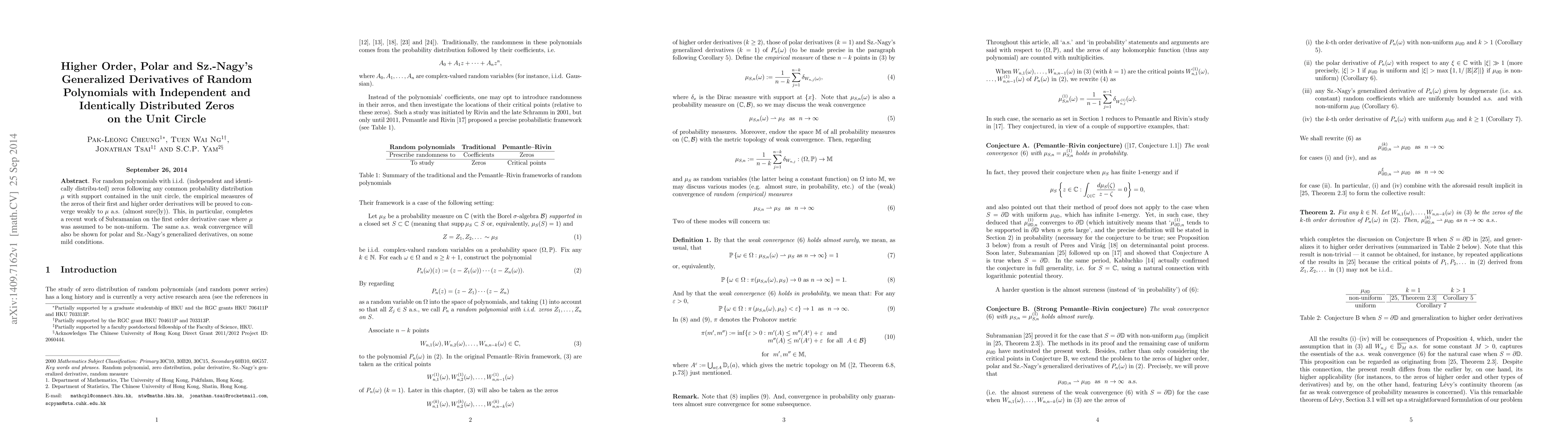 For random polynomials with i.i.d. (independent and identically distribu-ted) zeros following any common probability distribution $\mu$ with support contained in the unit circle, the empirical measures of the zeros of their first and higher order derivatives will be proved to converge weakly to $\mu$ a.s. (almost sure(ly)). This, in particular, completes a recent work of Subramanian on the first order derivative case where $\mu$ was assumed to be non-uniform. The same a.s. weak convergence will also be shown for polar and Sz.-Nagy's generalized derivatives, on some mild conditions.