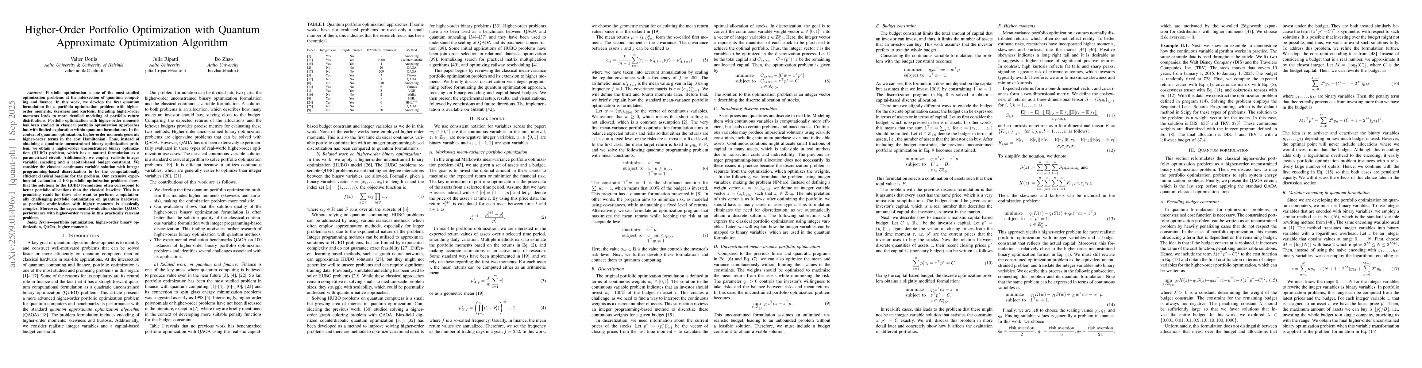 Portfolio optimization is one of the most studied optimization problems at the intersection of quantum computing and finance. In this work, we develop the first quantum formulation for a portfolio optimization problem with higher-order moments, skewness and kurtosis. Including higher-order moments leads to more detailed modeling of portfolio return distributions. Portfolio optimization with higher-order moments has been studied in classical portfolio optimization approaches but with limited exploration within quantum formulations. In the context of quantum optimization, higher-order moments generate higher-order terms in the cost Hamiltonian. Thus, instead of obtaining a quadratic unconstrained binary optimization problem, we obtain a higher-order unconstrained binary optimization (HUBO) problem, which has a natural formulation as a parametrized circuit. Additionally, we employ realistic integer variable encoding and a capital-based budget constraint. We consider the classical continuous variable solution with integer programming-based discretization to be the computationally efficient classical baseline for the problem. Our extensive experimental evaluation of 100 portfolio optimization problems shows that the solutions to the HUBO formulation often correspond to better portfolio allocations than the classical baseline. This is a promising result for those who want to perform computationally challenging portfolio optimization on quantum hardware, as portfolio optimization with higher moments is classically complex. Moreover, the experimental evaluation studies QAOA's performance with higher-order terms in this practically relevant problem.