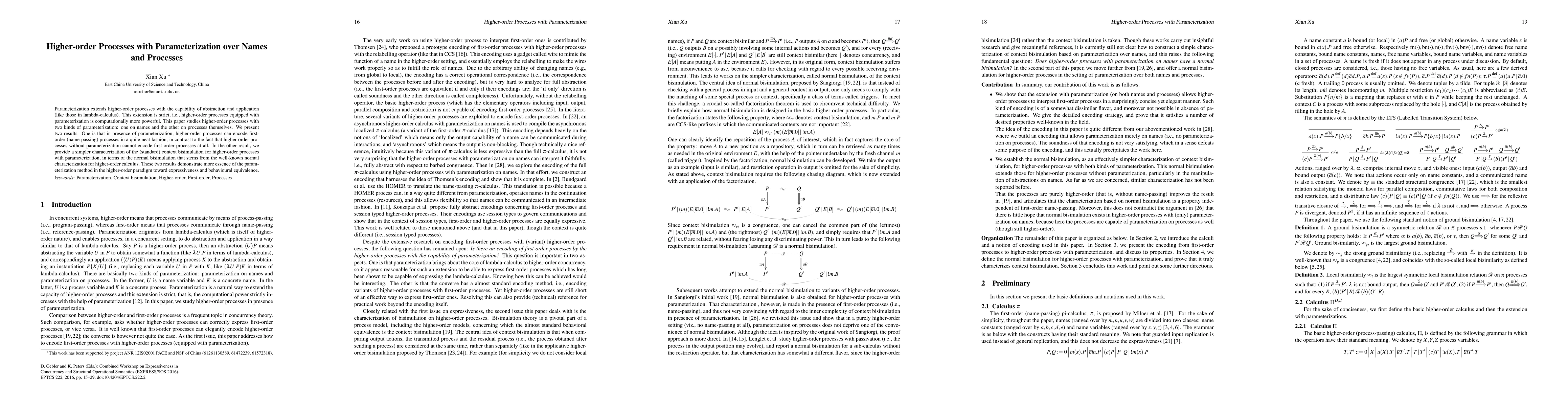 This paper investigates higher-order processes with parameterization over names and processes, demonstrating their computational power. It shows that parameterized higher-order processes can encode first-order processes effectively, and presents a simplified context bisimulation characterization for behavioral equivalence.