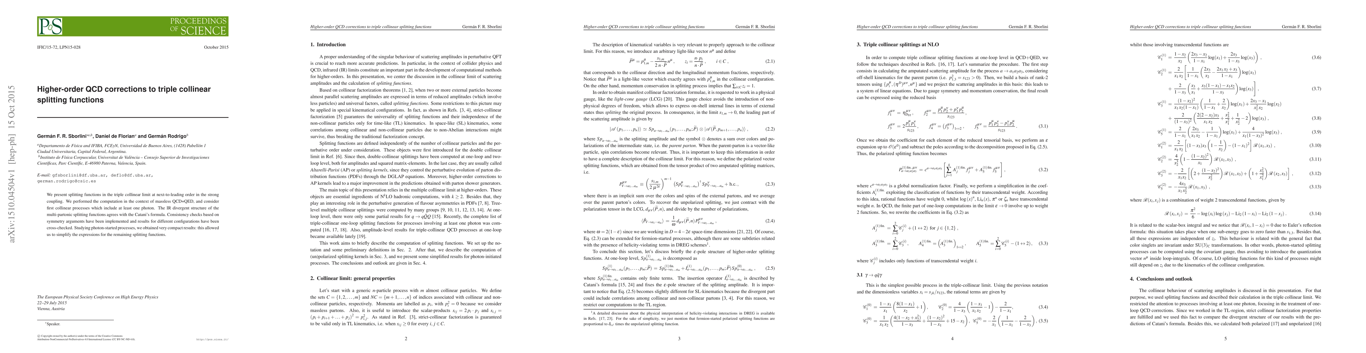 This paper computes next-to-leading order QCD corrections for triple collinear splitting functions in massless QCD+QED, focusing on processes involving at least one photon. The IR divergent structure aligns with Catani's formula, and results are verified through symmetry checks and cross-comparisons.