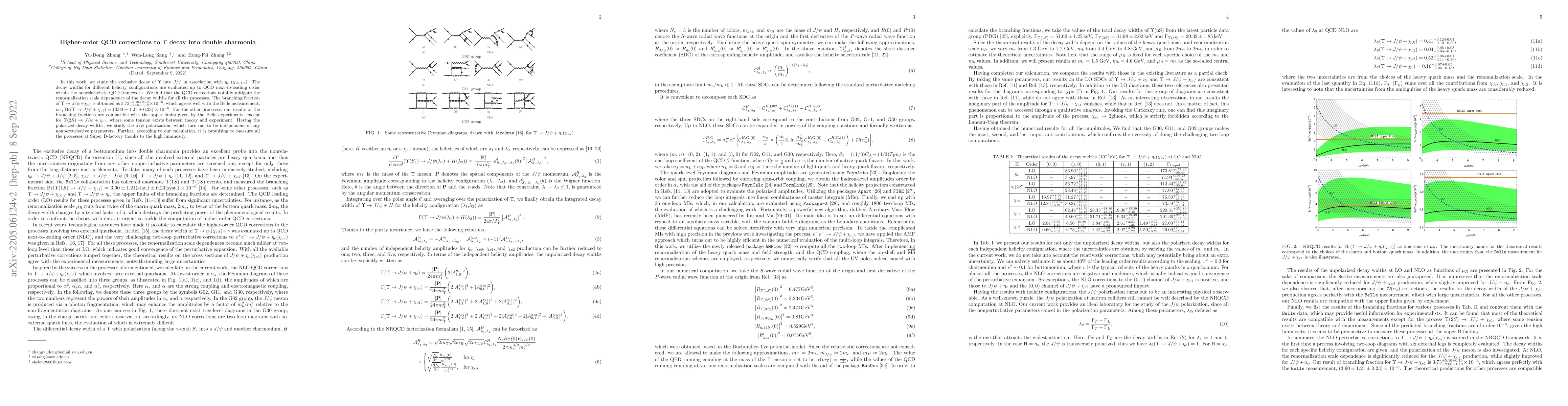 This paper evaluates higher-order QCD corrections for the decay of $\Upsilon$ into $J/\psi$ and $\eta_c$ ($\chi_{c0,1,2}$) within nonrelativistic QCD, finding that these corrections reduce the renormalization scale dependence. The calculated branching fraction for $\Upsilon\rightarrow J/\psi+\chi_{c1}$ aligns well with experimental measurements, while other processes show compatibility with upper limits, except for $\Upsilon(2S)\to J/\psi +\chi_{c1}$.