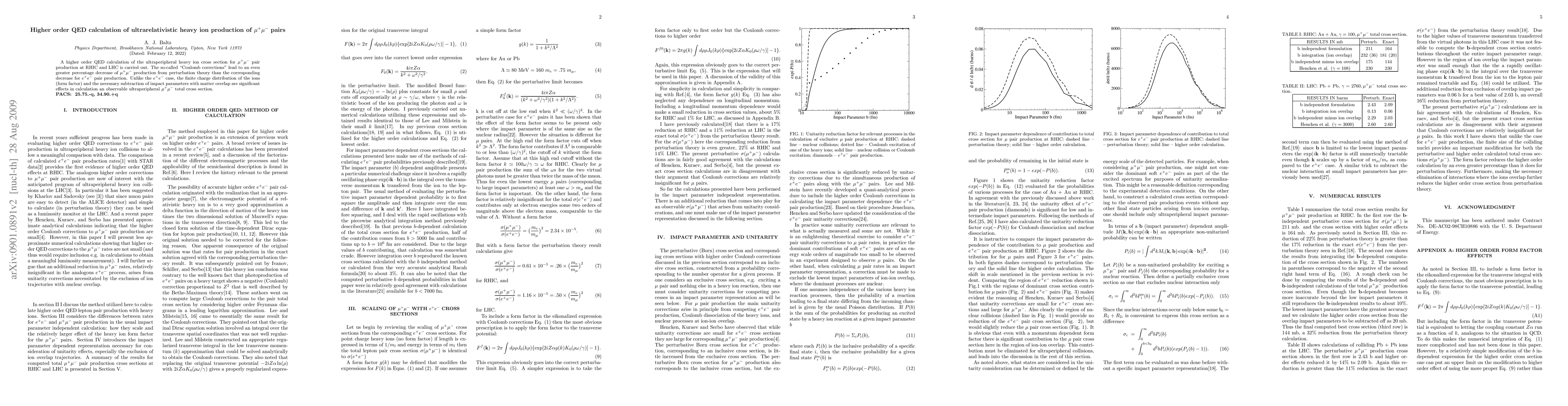 A higher order QED calculation of the ultraperipheral heavy ion cross section for mu+ mu- pair production at RHIC and LHC is carried out. The so-called "Coulomb corrections" lead to an even greater percentage decrease of mu+ mu- production from perturbation theory than the corresponding decrease for e+ e- pair production. Unlike the e+ e- case, the finite charge distribution of the ions (form factor) and the necessary subtraction of impact parameters with matter overlap are significant effects in calculation an observable ultraperipheral mu+ mu- total cross section.