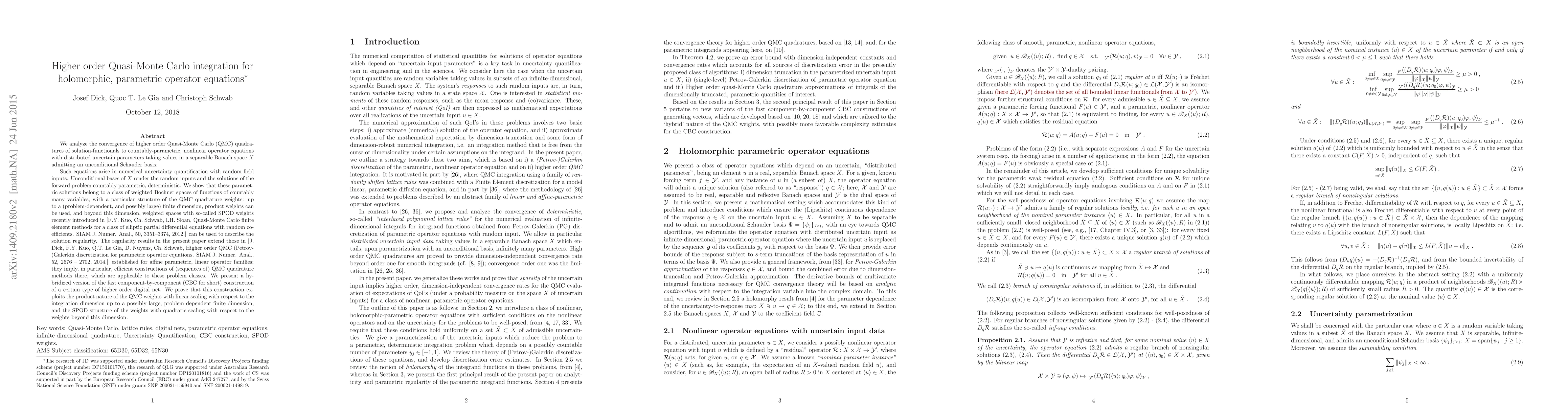 We analyze the convergence of higher order Quasi-Monte Carlo (QMC) quadratures of solution-functionals to countably-parametric, nonlinear operator equations with distributed uncertain parameters taking values in a separable Banach space $X$ admitting an unconditional Schauder basis. Such equations arise in numerical uncertainty quantification with random field inputs. Unconditional bases of $X$ render the random inputs and the solutions of the forward problem countably parametric, deterministic. We show that these parametric solutions belong to a class of weighted Bochner spaces of functions of countably many variables, with a particular structure of the QMC quadrature weights: up to a (problem-dependent, and possibly large) finite dimension, product weights can be used, and beyond this dimension, weighted spaces with so-called SPOD weights recently introduced in [F.Y.~Kuo, Ch.~Schwab, I.H.~Sloan, Quasi-Monte Carlo finite element methods for a class of elliptic partial differential equations with random coefficients. SIAM J. Numer. Anal., 50, 3351--3374, 2012.] can be used to describe the solution regularity. The regularity results in the present paper extend those in [J. Dick, F.Y.~Kuo, Q.T.~Le Gia, D.~Nuyens, Ch.~Schwab, Higher order QMC (Petrov-)Galerkin discretization for parametric operator equations. SIAM J. Numer. Anal., 52, 2676 -- 2702, 2014.] established for affine parametric, linear operator families; they imply, in particular, efficient constructions of (sequences of) QMC quadrature methods there, which are applicable to these problem classes. We present a hybridized version of the fast component-by-component (CBC for short) construction of a certain type of higher order digital net.