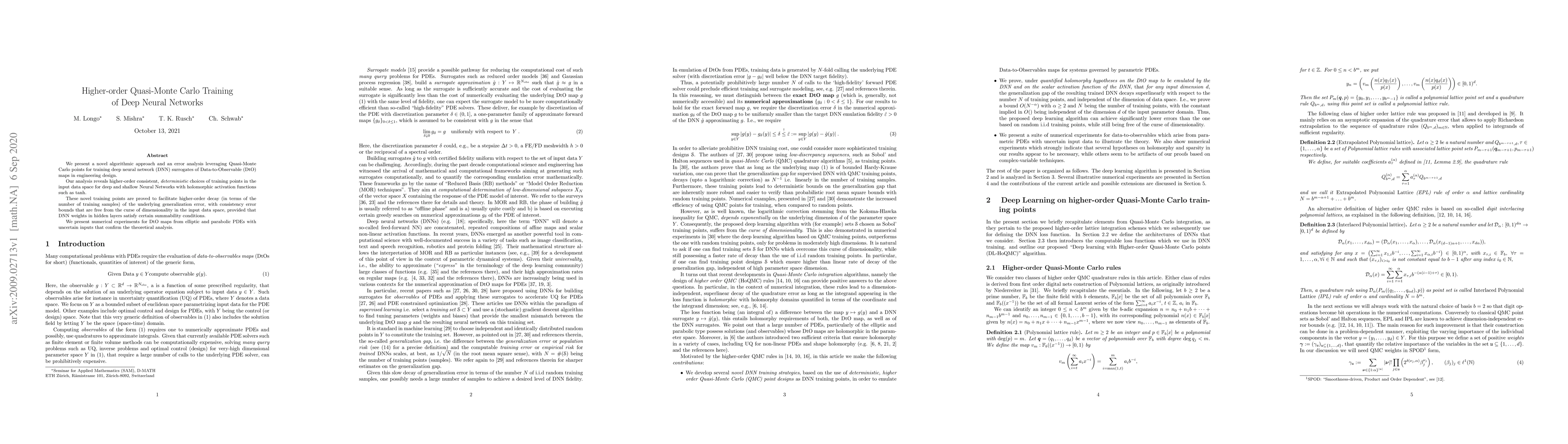 We present a novel algorithmic approach and an error analysis leveraging Quasi-Monte Carlo points for training deep neural network (DNN) surrogates of Data-to-Observable (DtO) maps in engineering design. Our analysis reveals higher-order consistent, deterministic choices of training points in the input data space for deep and shallow Neural Networks with holomorphic activation functions such as tanh. These novel training points are proved to facilitate higher-order decay (in terms of the number of training samples) of the underlying generalization error, with consistency error bounds that are free from the curse of dimensionality in the input data space, provided that DNN weights in hidden layers satisfy certain summability conditions. We present numerical experiments for DtO maps from elliptic and parabolic PDEs with uncertain inputs that confirm the theoretical analysis.