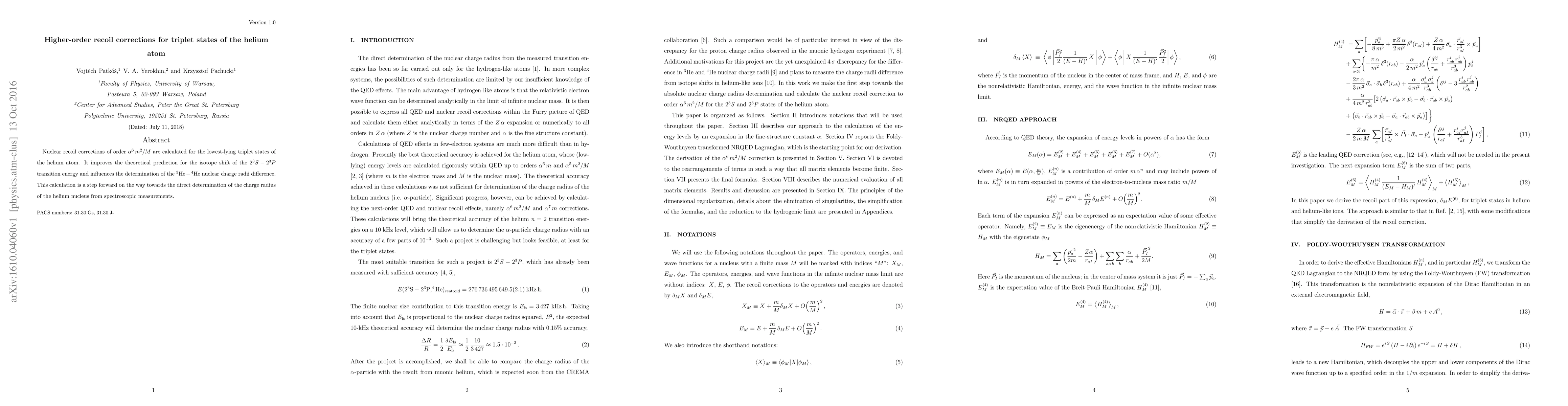 This paper calculates higher-order nuclear recoil corrections for the lowest-lying triplet states of the helium atom, enhancing the accuracy of the isotope shift prediction for the $2^3S-2^3P$ transition energy and refining the determination of the nuclear charge radii difference between ${}^3\textrm{He}$ and ${}^4\textrm{He}$.