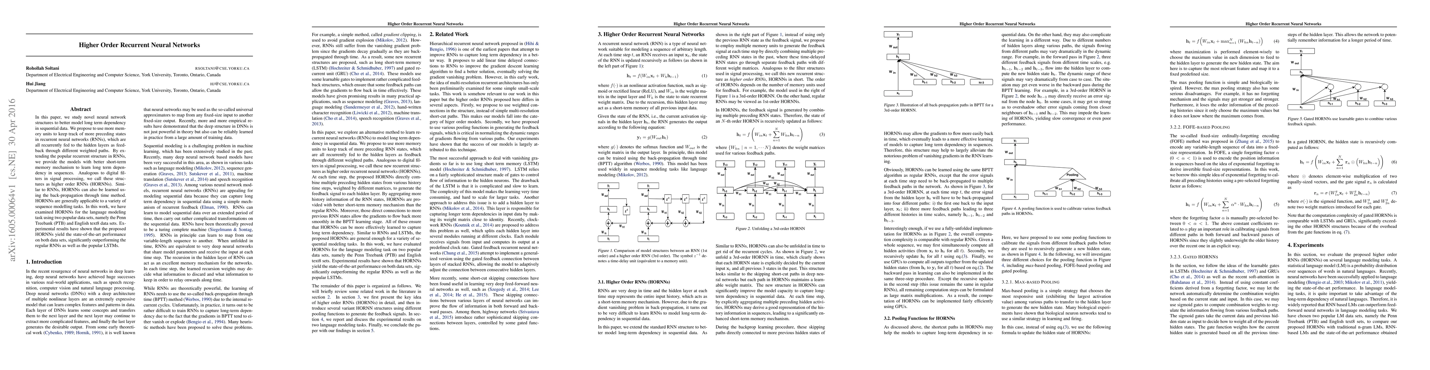 In this paper, we study novel neural network structures to better model long term dependency in sequential data. We propose to use more memory units to keep track of more preceding states in recurrent neural networks (RNNs), which are all recurrently fed to the hidden layers as feedback through different weighted paths. By extending the popular recurrent structure in RNNs, we provide the models with better short-term memory mechanism to learn long term dependency in sequences. Analogous to digital filters in signal processing, we call these structures as higher order RNNs (HORNNs). Similar to RNNs, HORNNs can also be learned using the back-propagation through time method. HORNNs are generally applicable to a variety of sequence modelling tasks. In this work, we have examined HORNNs for the language modeling task using two popular data sets, namely the Penn Treebank (PTB) and English text8 data sets. Experimental results have shown that the proposed HORNNs yield the state-of-the-art performance on both data sets, significantly outperforming the regular RNNs as well as the popular LSTMs.
