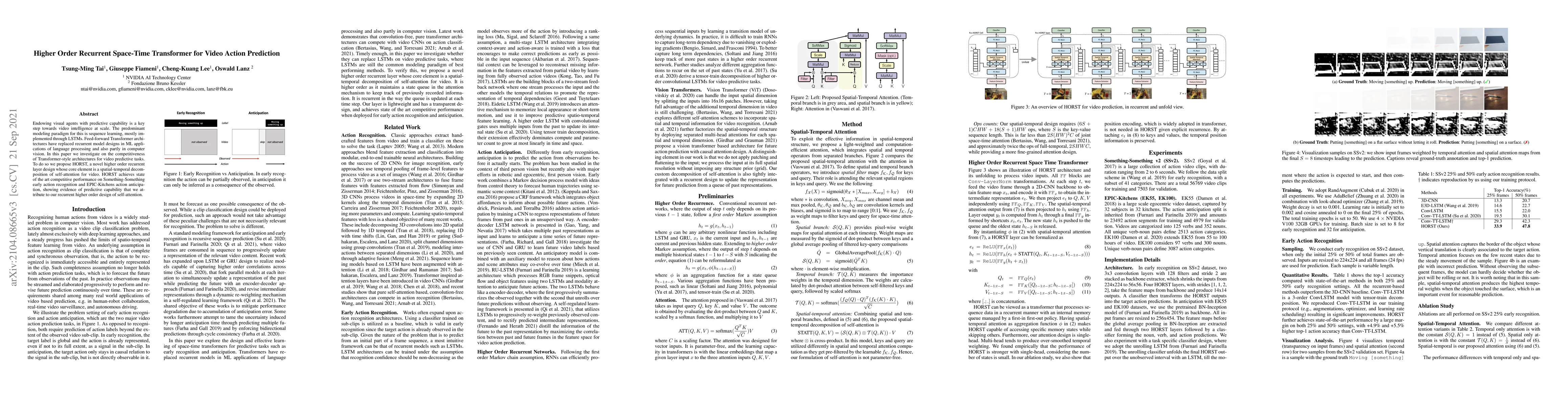 The paper introduces HORST, a novel Transformer-based architecture for video action prediction, outperforming traditional LSTM models. HORST uses a higher order recurrent layer with spatial-temporal self-attention decomposition, achieving state-of-the-art results in Something-Something early action recognition and EPIC-Kitchens action anticipation tasks.