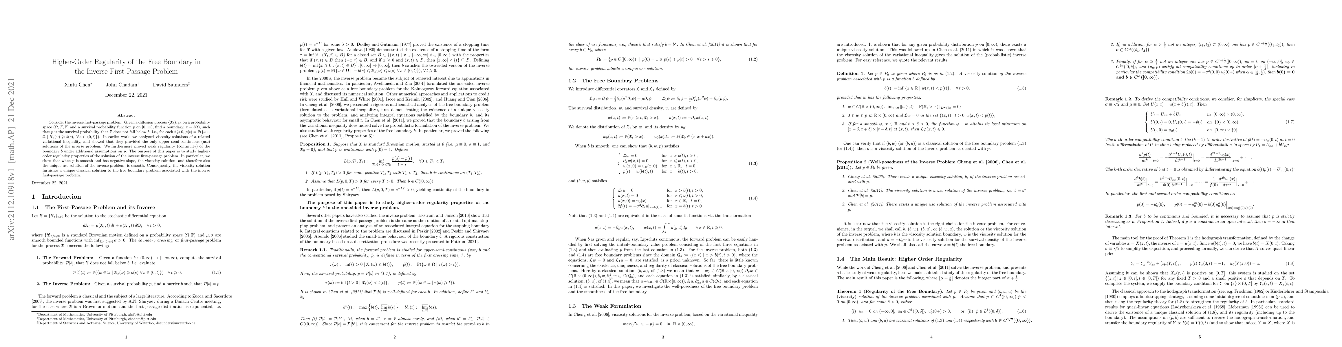 This paper investigates the higher-order regularity of the free boundary in the inverse first-passage problem, demonstrating that under smooth conditions with negative slope, the boundary solution is smooth and provides a classical solution to the associated free boundary problem.