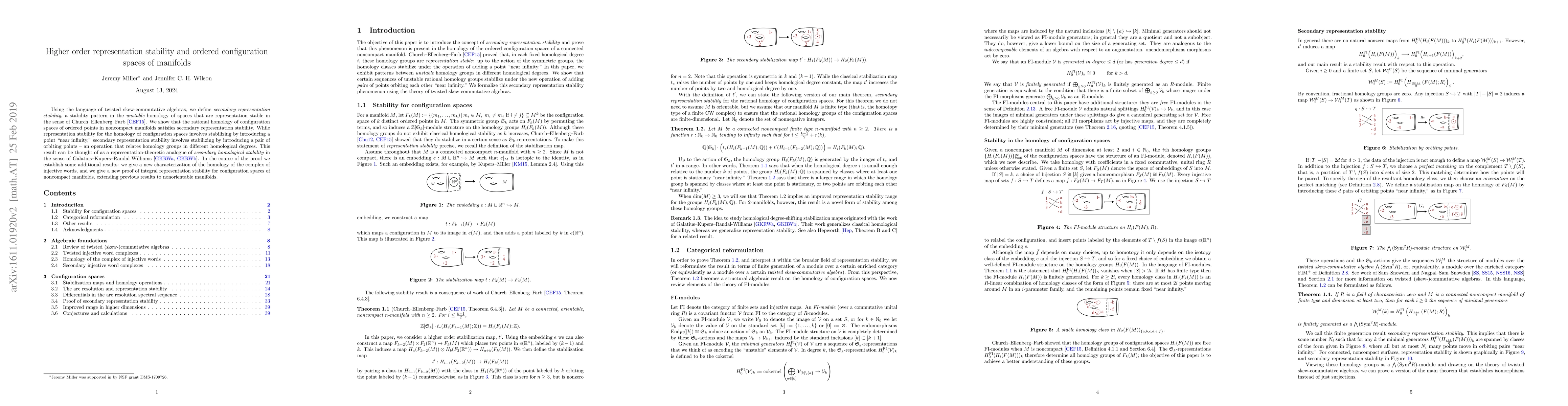 This paper introduces the concept of secondary representation stability in the context of twisted skew-commutative algebras, demonstrating its occurrence in the rational homology of configuration spaces of ordered points on noncompact manifolds. The approach involves stabilizing homology through the introduction of a pair of orbiting points, paralleling secondary homological stability.