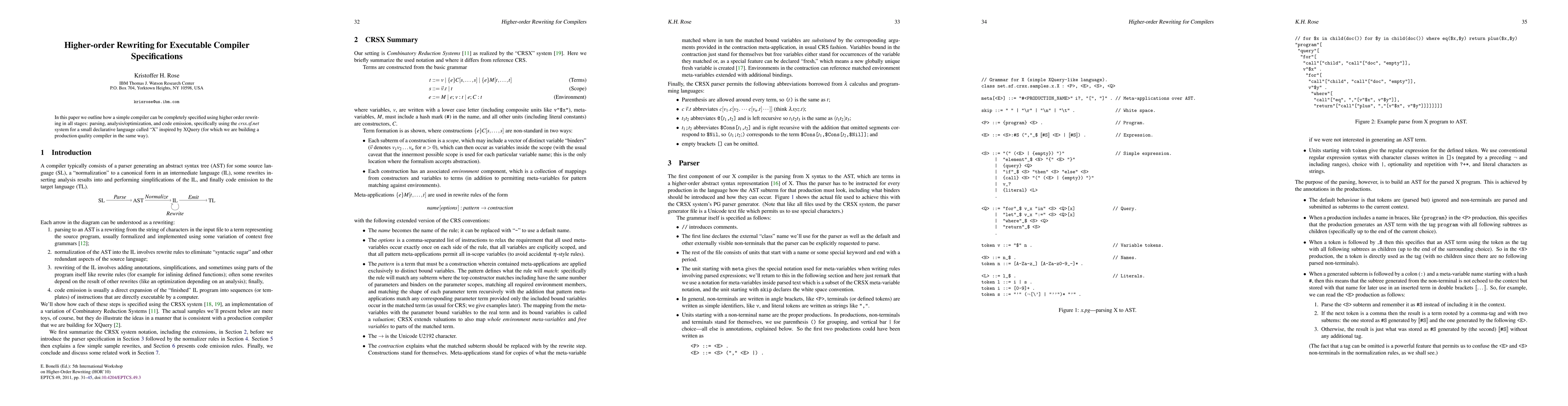 In this paper we outline how a simple compiler can be completely specified using higher order rewriting in all stages: parsing, analysis/optimization, and code emission, specifically using the crsx.sf.net system for a small declarative language called "X" inspired by XQuery (for which we are building a production quality compiler in the same way).