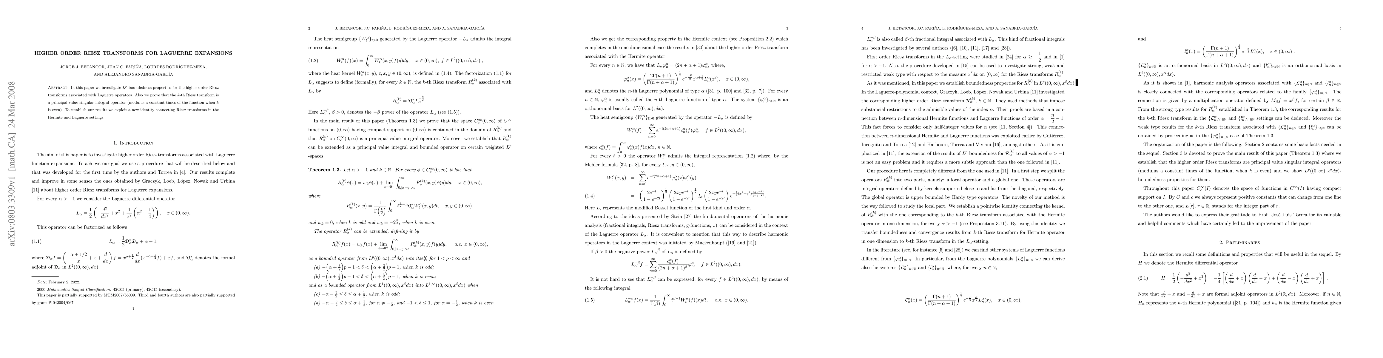 This paper explores the Lp-boundedness of higher order Riesz transforms linked to Laguerre operators and demonstrates that the k-th Riesz transform is a principal value singular integral operator, with a specific modulus when k is even. The findings are supported by a novel identity relating Riesz transforms in the Hermite and Laguerre frameworks.