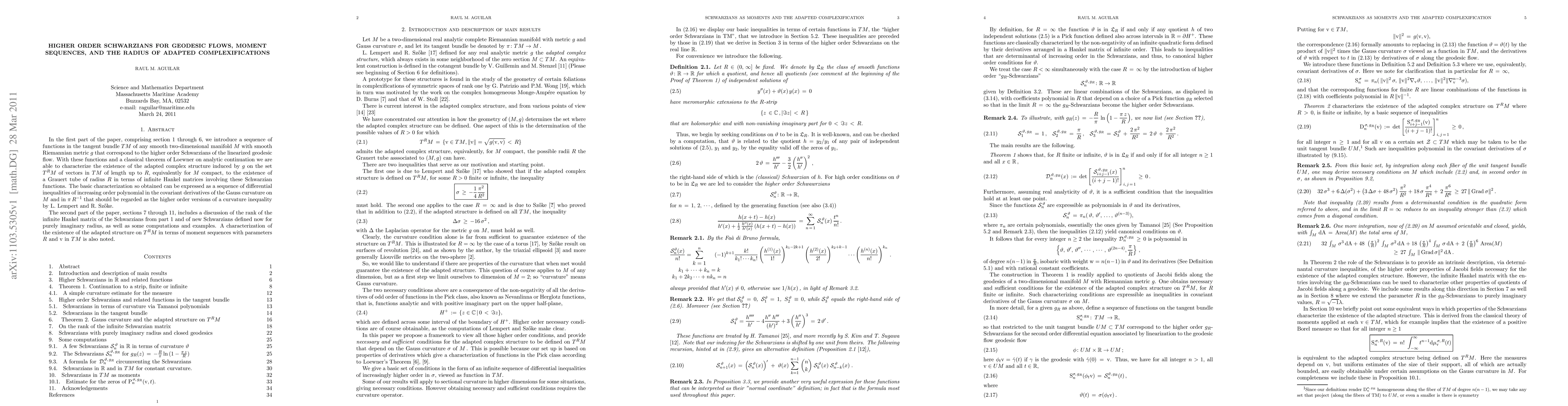 In the first part of the paper, comprising section 1 through 6, we introduce a sequence of functions in the tangent bundle TM of any smooth two-dimensional manifold M with smooth Riemannian metric g that correspond to the higher order Schwarzians of the linearized geodesic flow. With these functions and a classical theorem of Loewner on analytic continuation we are able to characterize the existence of the adapted complex structure induced by g on the set T^RM of vectors in TM of length up to R, equivalently for M compact, to the existence of a Grauert tube of radius R in terms of infinite Hankel matrices involving these Schwarzian functions. The basic characterization so obtained can be expressed as a sequence of differential inequalities of increasing order polynomial in the covariant derivatives of the Gauss curvature on M and in {\pi}/R that should be regarded as the higher order versions of a curvature inequality by L. Lempert and R. Sz\"oke. The second part of the paper, sections 7 through 11, includes a discussion of the rank of the infinite Hankel matrix of the Schwarzians from part 1 and of new Schwarzians defined now for purely imaginary radius, as well as some computations and examples. A characterization of the existence of the adapted structure on T^RM in terms of moment sequences with parameters R and v in TM is also noted.