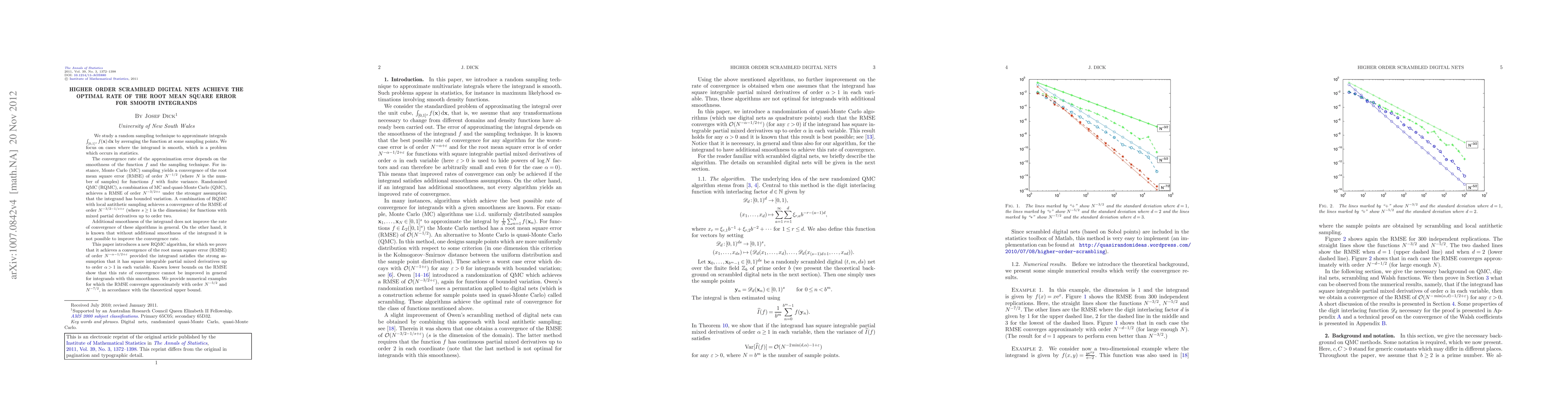 We study a random sampling technique to approximate integrals $\int_{[0,1]^s}f(\mathbf{x})\,\mathrm{d}\mathbf{x}$ by averaging the function at some sampling points. We focus on cases where the integrand is smooth, which is a problem which occurs in statistics. The convergence rate of the approximation error depends on the smoothness of the function $f$ and the sampling technique. For instance, Monte Carlo (MC) sampling yields a convergence of the root mean square error (RMSE) of order $N^{-1/2}$ (where $N$ is the number of samples) for functions $f$ with finite variance. Randomized QMC (RQMC), a combination of MC and quasi-Monte Carlo (QMC), achieves a RMSE of order $N^{-3/2+\varepsilon}$ under the stronger assumption that the integrand has bounded variation. A combination of RQMC with local antithetic sampling achieves a convergence of the RMSE of order $N^{-3/2-1/s+\varepsilon}$ (where $s\ge1$ is the dimension) for functions with mixed partial derivatives up to order two. Additional smoothness of the integrand does not improve the rate of convergence of these algorithms in general. On the other hand, it is known that without additional smoothness of the integrand it is not possible to improve the convergence rate. This paper introduces a new RQMC algorithm, for which we prove that it achieves a convergence of the root mean square error (RMSE) of order $N^{-\alpha-1/2+\varepsilon}$ provided the integrand satisfies the strong assumption that it has square integrable partial mixed derivatives up to order $\alpha>1$ in each variable. Known lower bounds on the RMSE show that this rate of convergence cannot be improved in general for integrands with this smoothness. We provide numerical examples for which the RMSE converges approximately with order $N^{-5/2}$ and $N^{-7/2}$, in accordance with the theoretical upper bound.