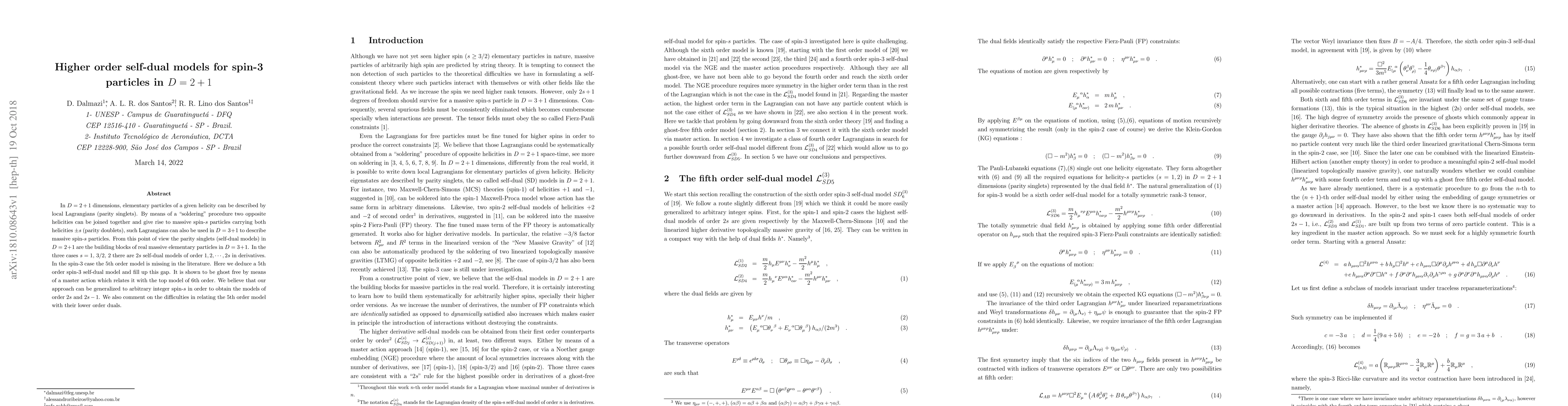 In $D=2+1$ dimensions, elementary particles of a given helicity can be described by local Lagrangians (parity singlets). By means of a "soldering" procedure two opposite helicities can be joined together and give rise to massive spin-$s$ particles carrying both helicities $\pm s$ (parity doublets), such Lagrangians can also be used in $D=3+1$ to describe massive spin-$s$ particles. From this point of view the parity singlets (self-dual models) in $D=2+1$ are the building blocks of real massive elementary particles in $D=3+1$. In the three cases $s=1,\, 3/2,\, 2$ there are $2s$ self-dual models of order $1,2, \cdots, 2s$ in derivatives. In the spin-3 case the 5th order model is missing in the literature. Here we deduce a 5th order spin-3 self-dual model and fill up this gap. It is shown to be ghost free by means of a master action which relates it with the top model of 6th order. We believe that our approach can be generalized to arbitrary integer spin-$s$ in order to obtain the models of order $2s$ and $2s-1$. We also comment on the difficulties in relating the 5th order model with their lower order duals.