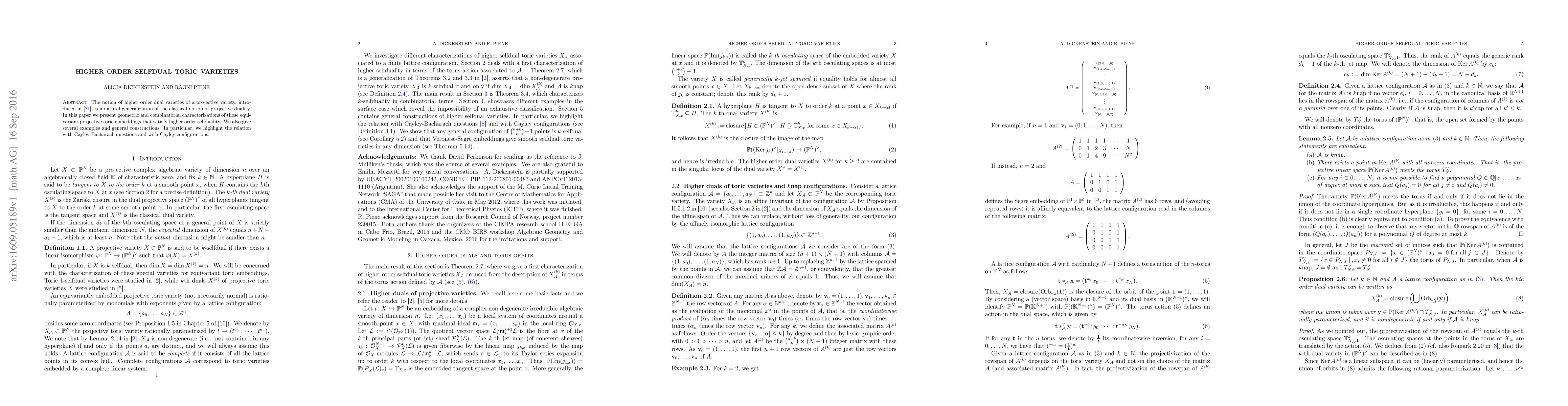 This paper explores higher order dual varieties of projective toric varieties, providing geometric and combinatorial characterizations of selfdual embeddings. It also connects these concepts to Cayley-Bacharach questions and configurations.