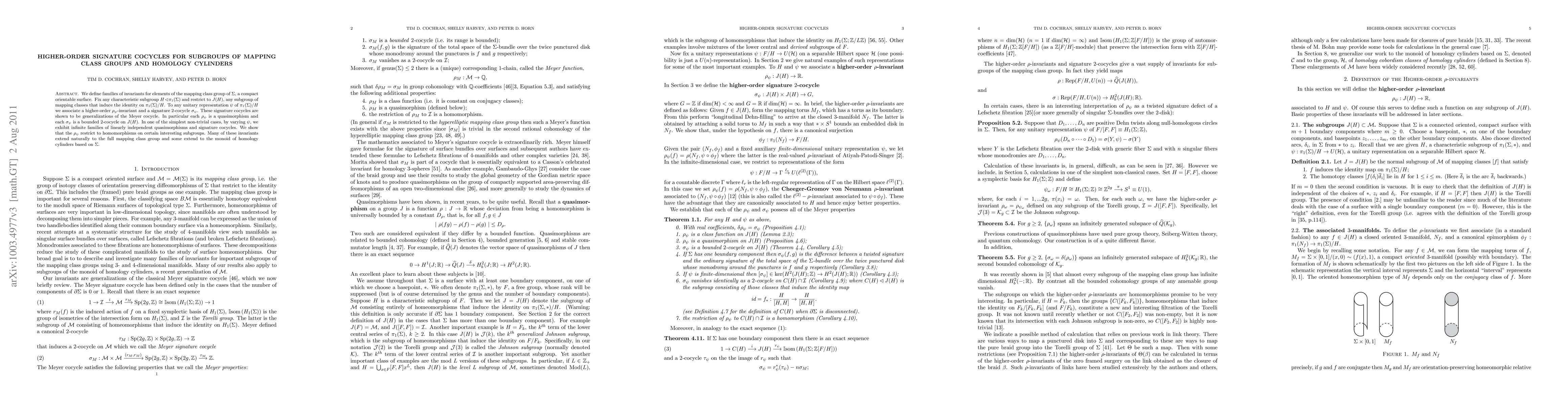 This paper introduces higher-order signature cocycles for subgroups of mapping class groups associated with characteristic subgroups of the fundamental group of a compact orientable surface, generalizing the Meyer cocycle. It demonstrates the construction of quasimorphisms and signature cocycles from unitary representations, extending these invariants to homology cylinders.
