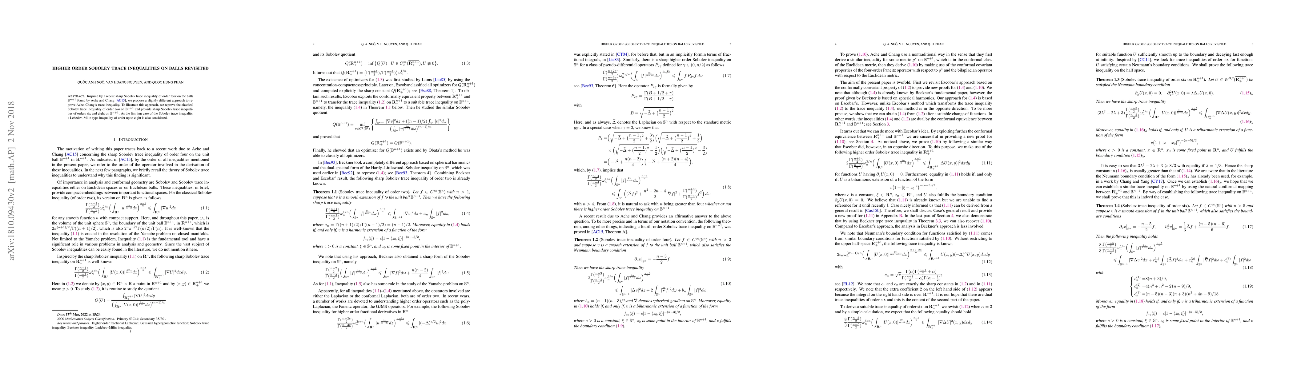 This paper revisits higher order Sobolev trace inequalities on balls, proposing a new approach to reprove Ache and Chang's sharp trace inequality of order four. It also reproves the classical order two inequality and provides sharp inequalities of orders six and eight, along with a Lebedev-Milin type inequality up to order eight.