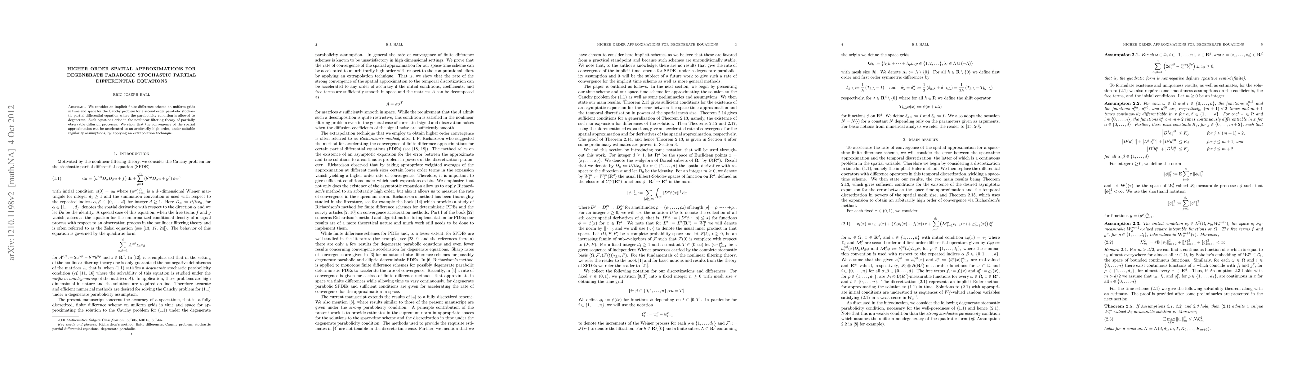 We consider an implicit finite difference scheme on uniform grids in time and space for the Cauchy problem for a second order parabolic stochastic partial differential equation where the parabolicity condition is allowed to degenerate. Such equations arise in the nonlinear filtering theory of partially observable diffusion processes. We show that the convergence of the spatial approximation can be accelerated to an arbitrarily high order, under suitable regularity assumptions, by applying an extrapolation technique.