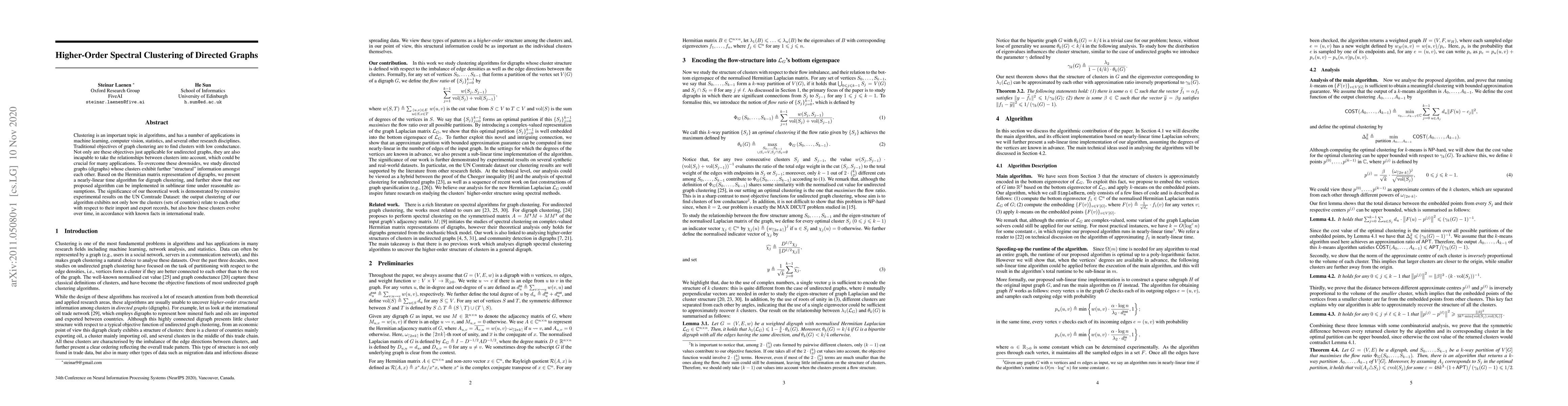 The paper presents a higher-order spectral clustering method for directed graphs (digraphs), utilizing the Hermitian matrix representation and proposing a nearly-linear time algorithm that can be implemented in sublinear time under reasonable assumptions.