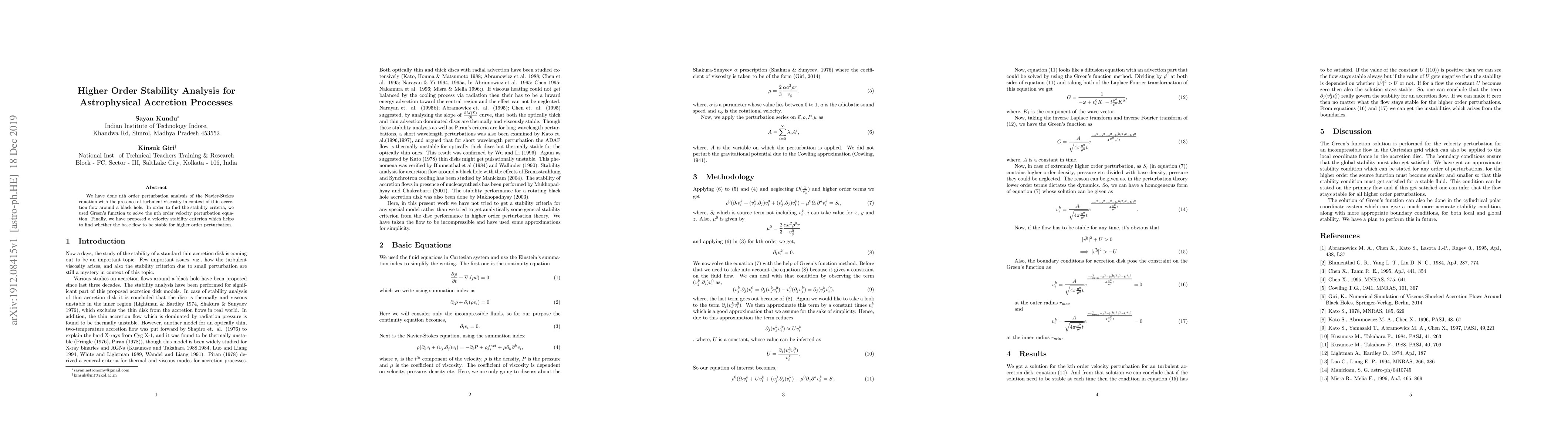 We have done nth order perturbation analysis of the Navier-Stokes equation with the presence of turbulent viscosity in context of thin accretion flow around a black hole. In order to find the stability criteria, we used Green's function to solve the nth order velocity perturbation equation. Finally, we have proposed a velocity stability criterion which helps to find whether the base flow to be stable for higher order perturbation.